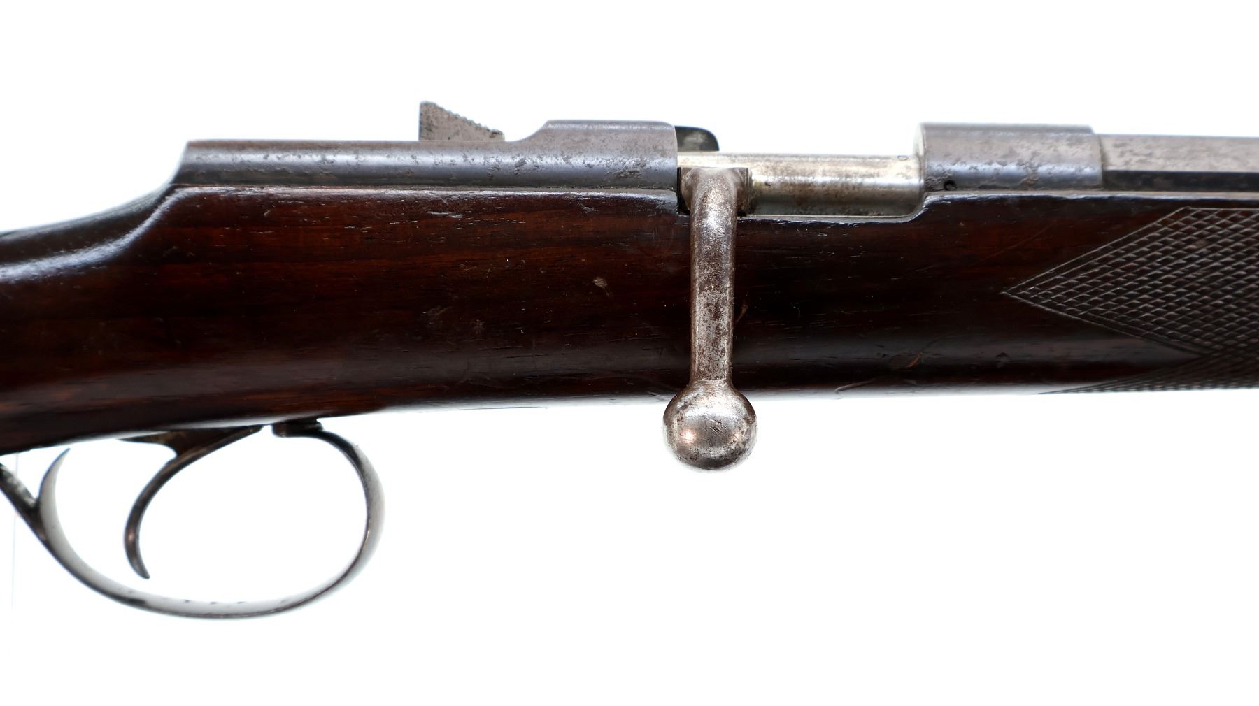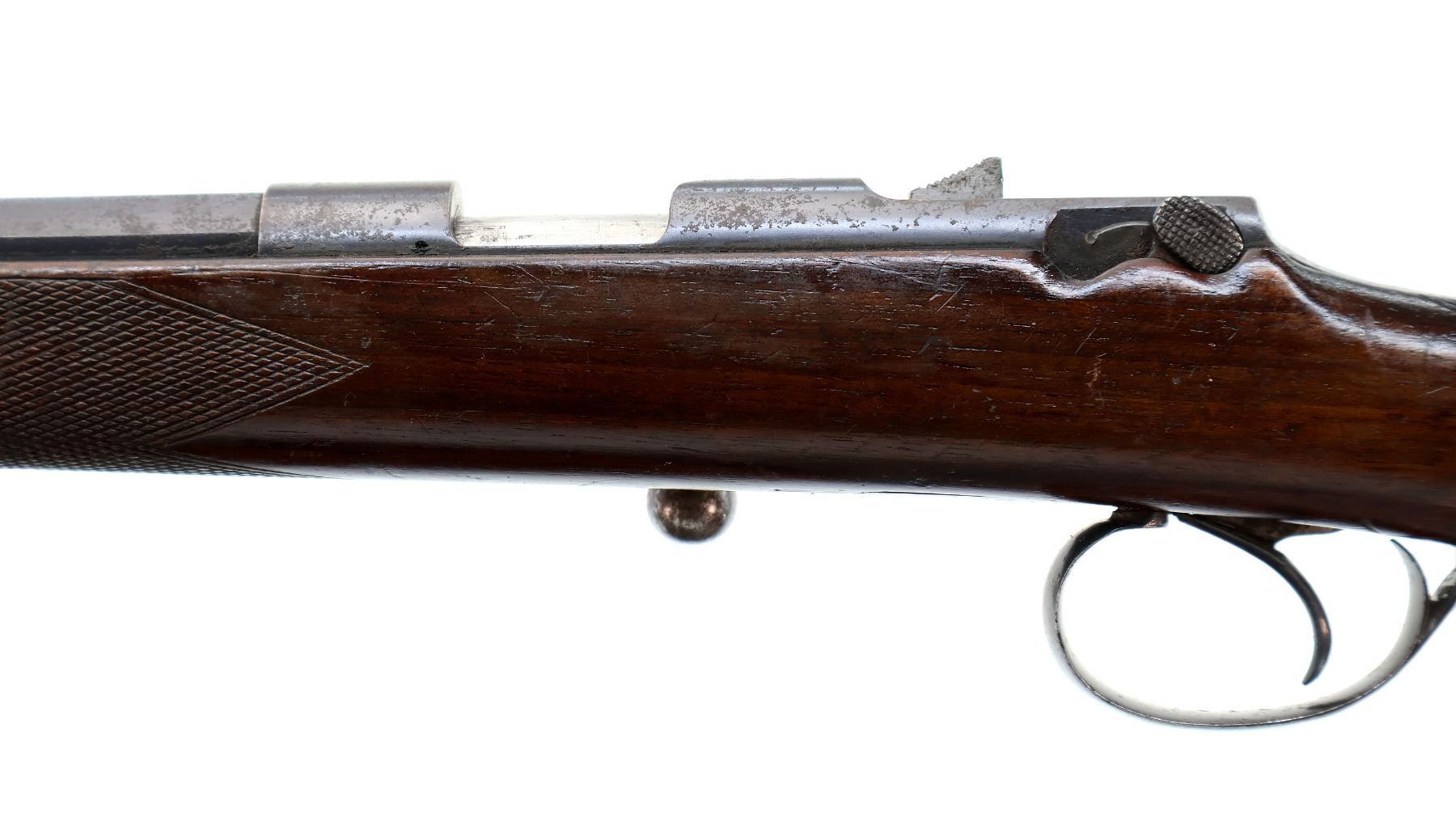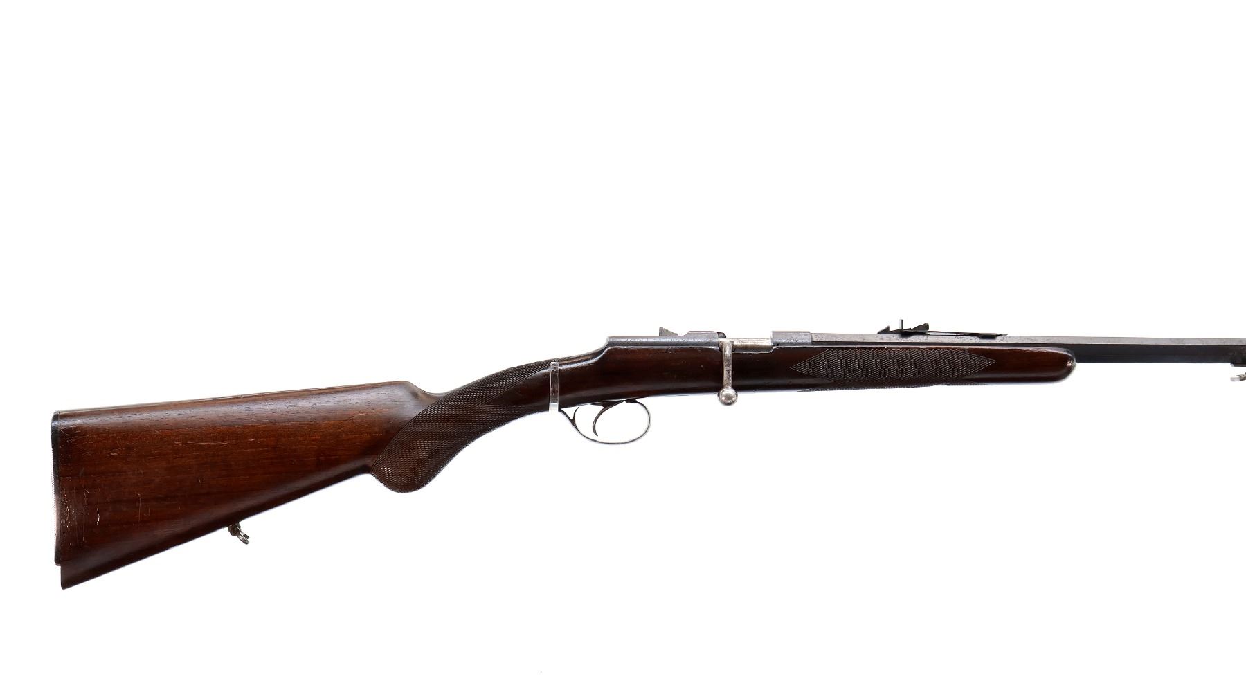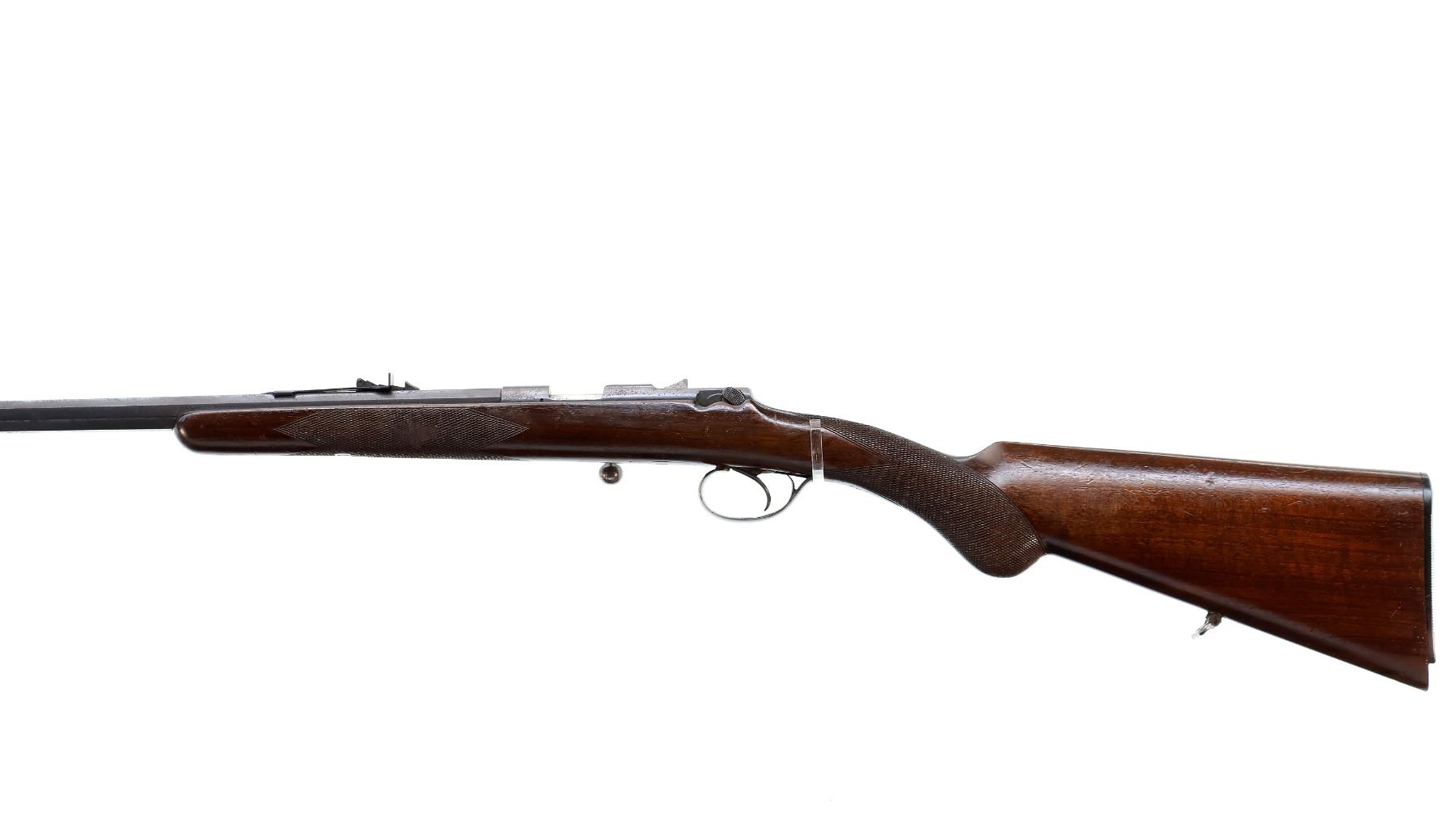 Main Description: Blade front sight, adjustable u notched rear sight, blued finish, octagon barrel, small round bolt knob, missing extractor. One piece wood stock, checkered forearm and pistol grip, grooved black polymer butt plate broken at toe, sling swivels.