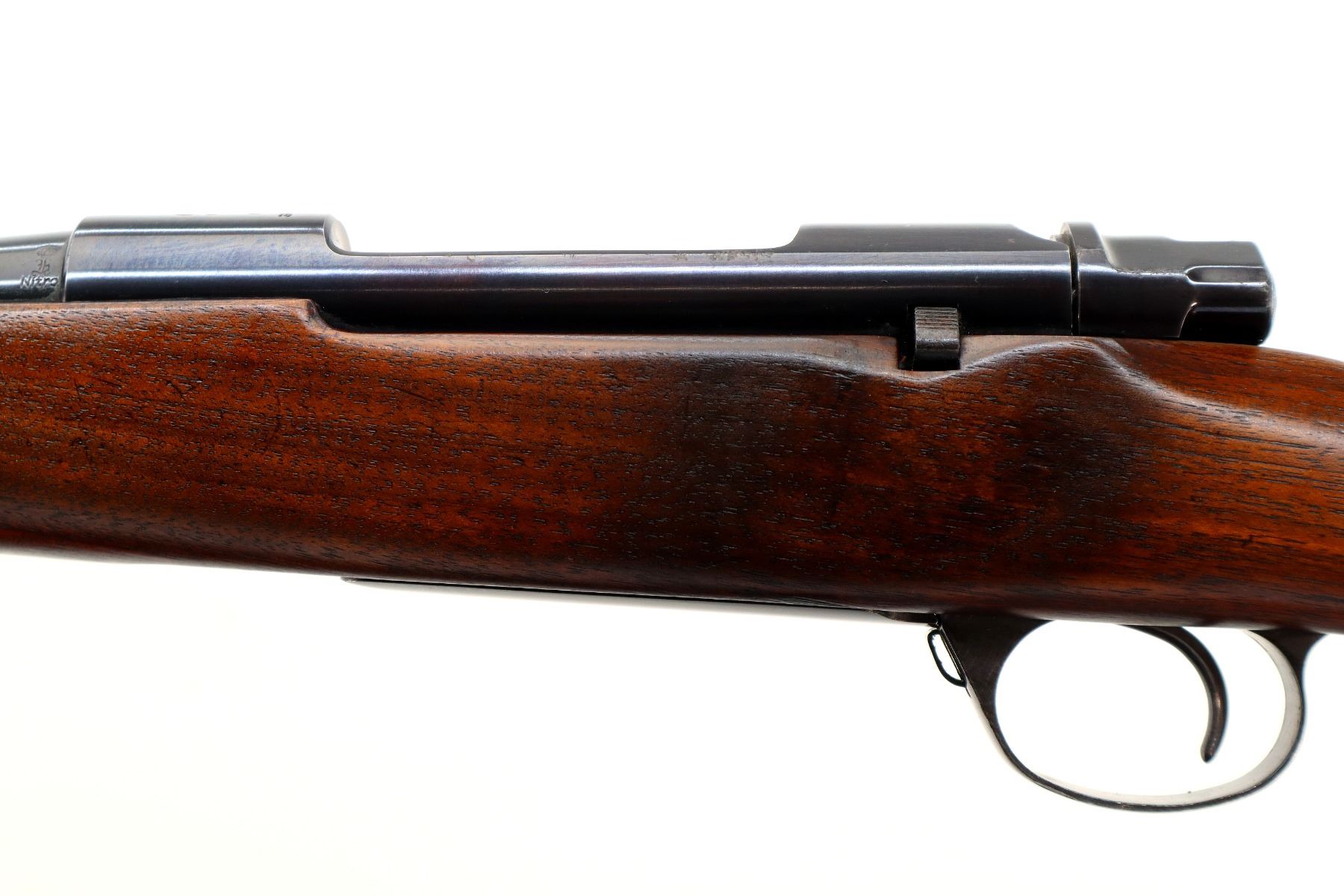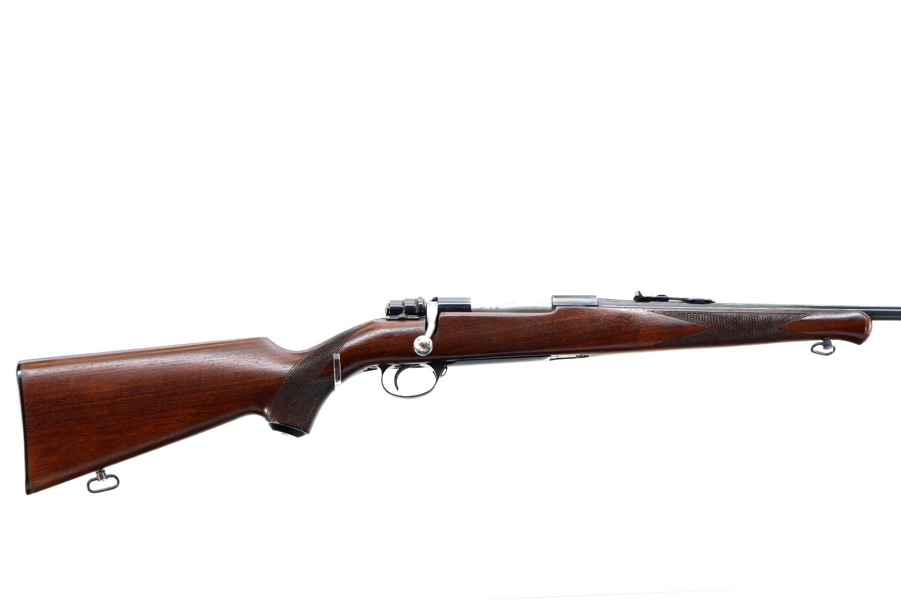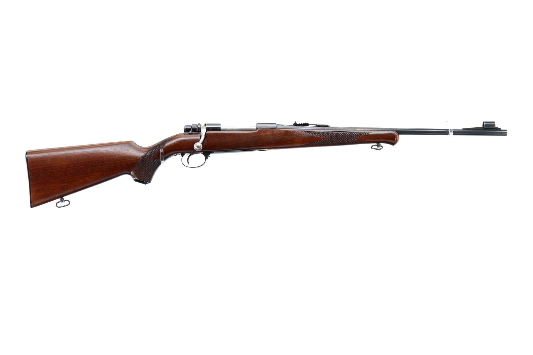 Main Description: Blade front sight with hood and ramp, adjustable u notched rear sight, blued finish, receiver drilled and tapped with plug screws installed, smooth bolt knob. One piece wood stock, Schnabel forend tip, checkered forearm and pistol grip, small crack behind tang, cheek rest, grooved black polymer butt plate, grip cap, hinged floor plate, sling swivels.