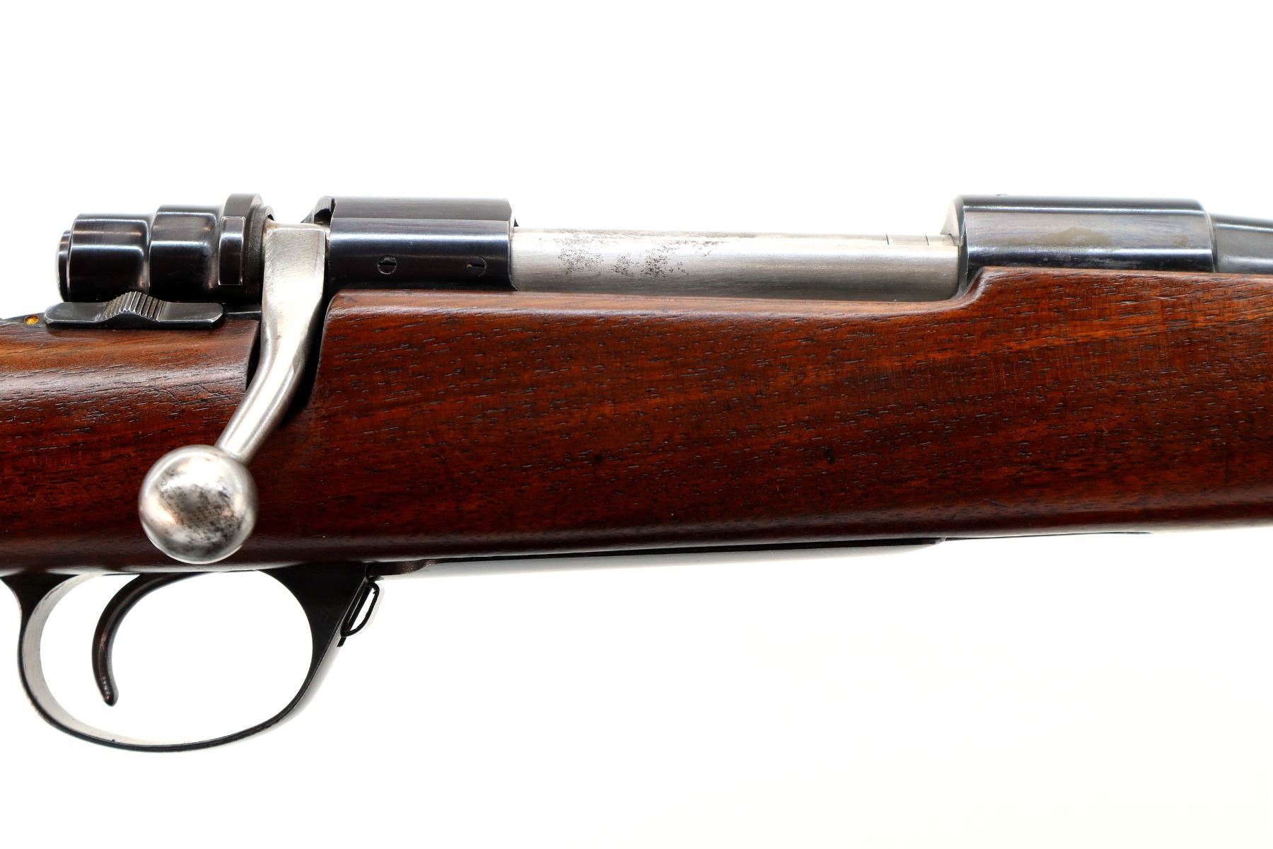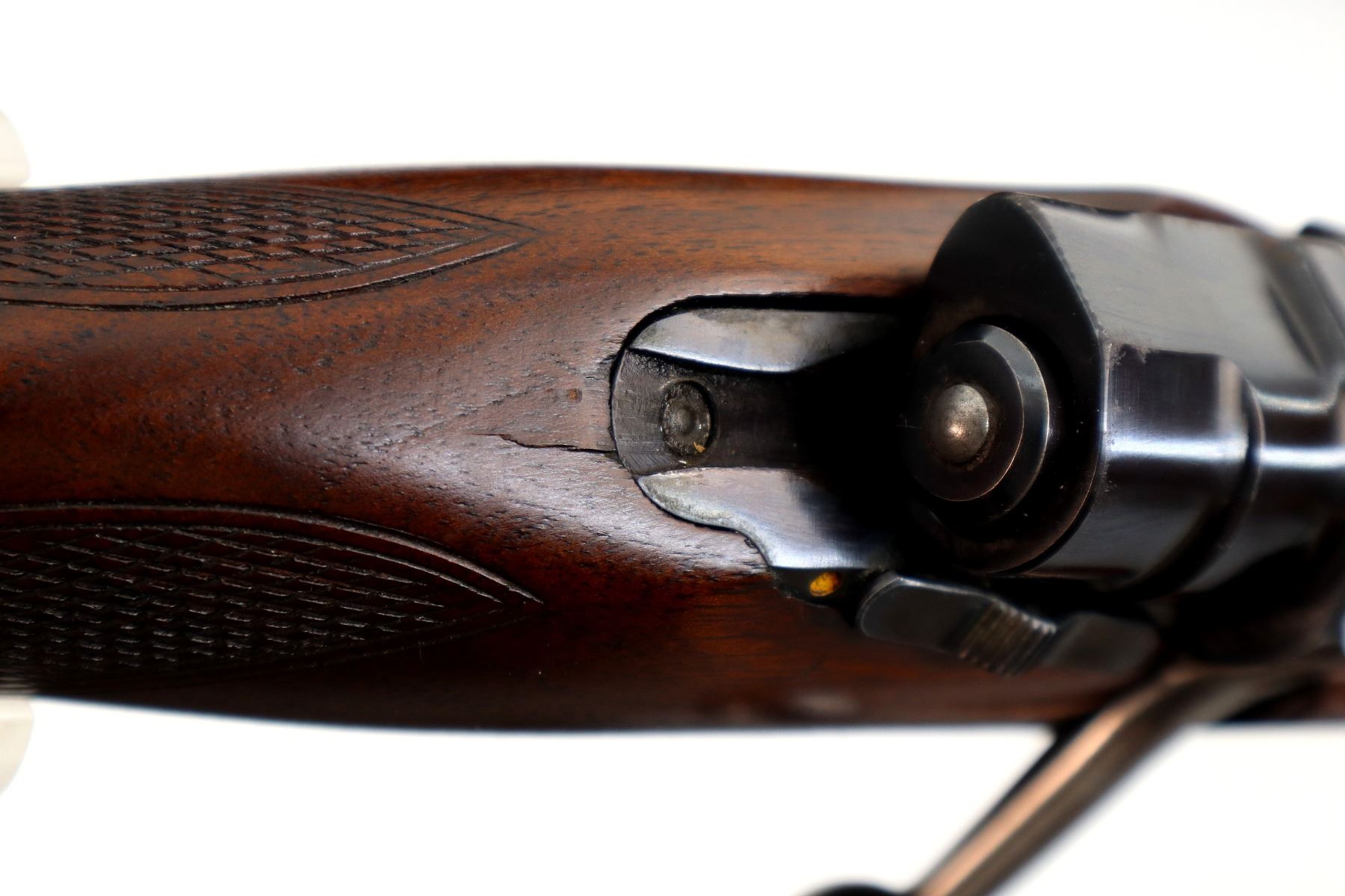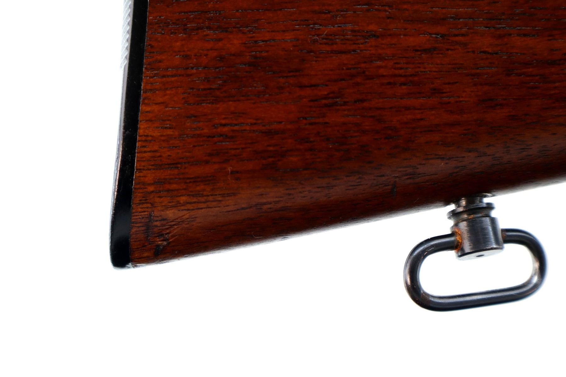 Main Description: Blade front sight with hood and ramp, adjustable u notched rear sight, blued finish, receiver drilled and tapped with plug screws installed, smooth bolt knob. One piece wood stock, Schnabel forend tip, checkered forearm and pistol grip, small crack behind tang, cheek rest, grooved black polymer butt plate, grip cap, hinged floor plate, sling swivels.
