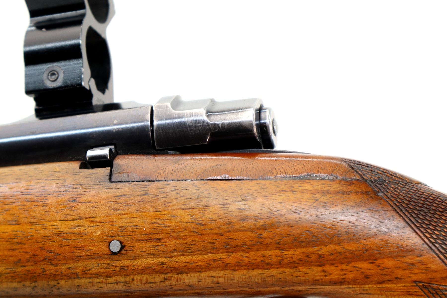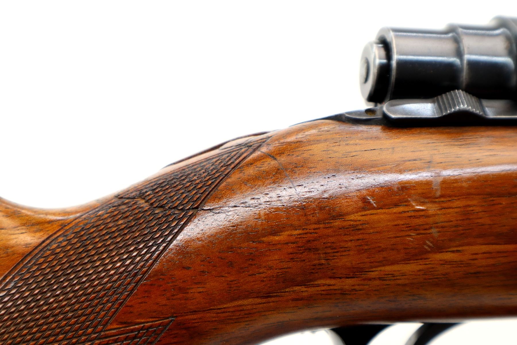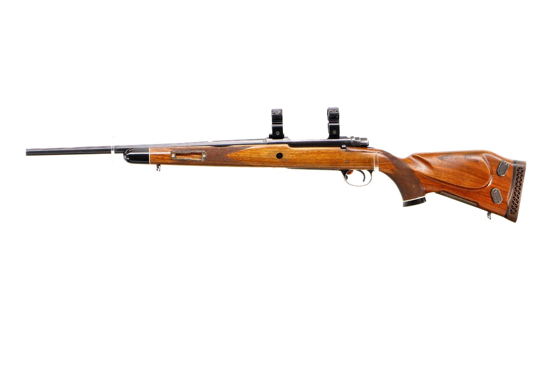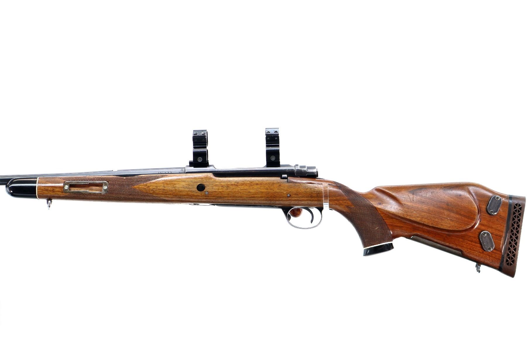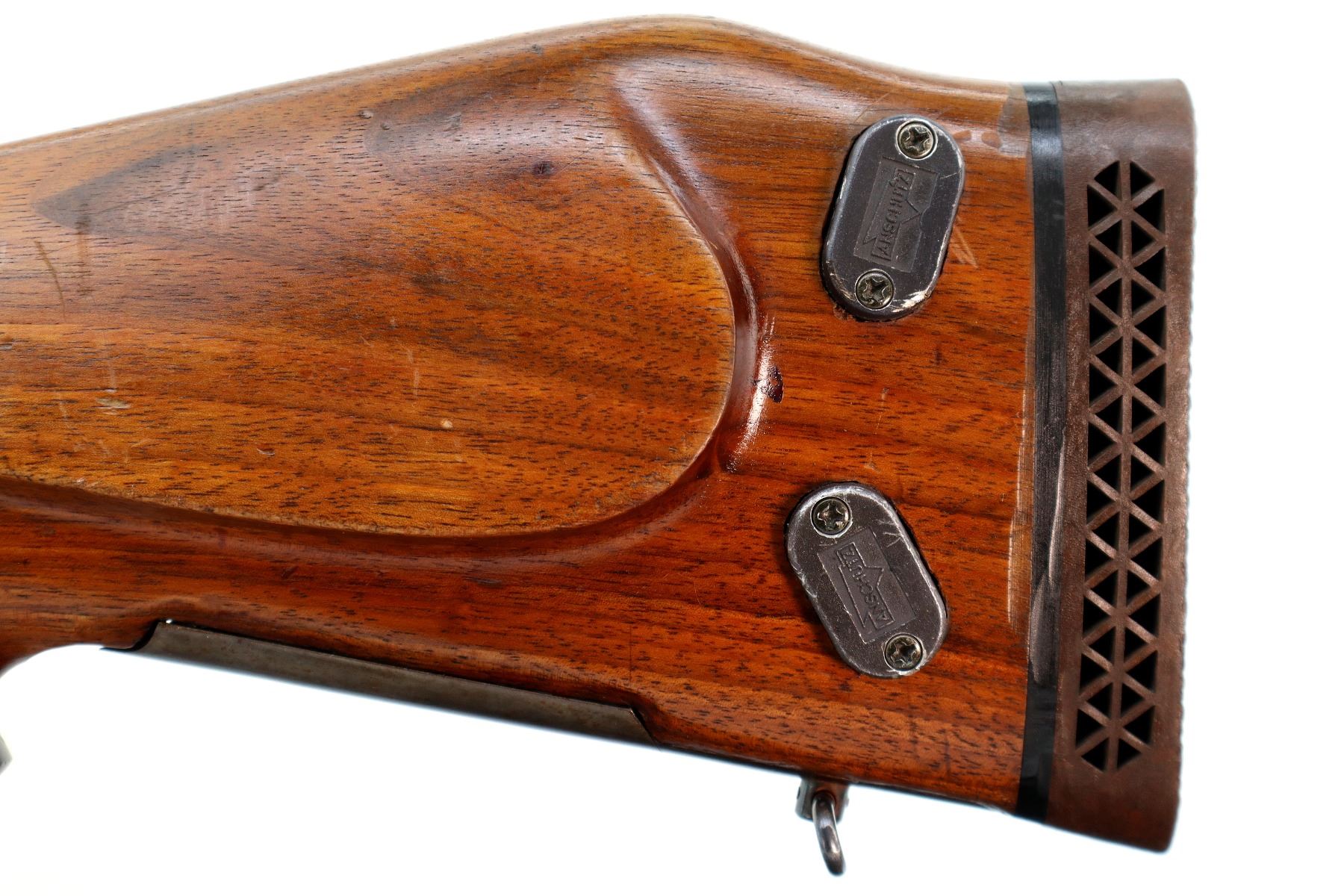 Main Description: Missing front and rear sights, rear dovetail present, blued finish, receiver drilled and tapped with two piece 1" see thru rings installed, large wood bolt knob. One piece wood stock, black polymer forend and pistol grip caps, checkered forearm and pistol grip chipped and cracked behind receiver, cheek rest, brown vented rubber recoil pad, 12.75" LOP, hinged floor plate, four round shell holder in bottom of stock, sling swivels, also has three Anschutz Biathlon sling points installed