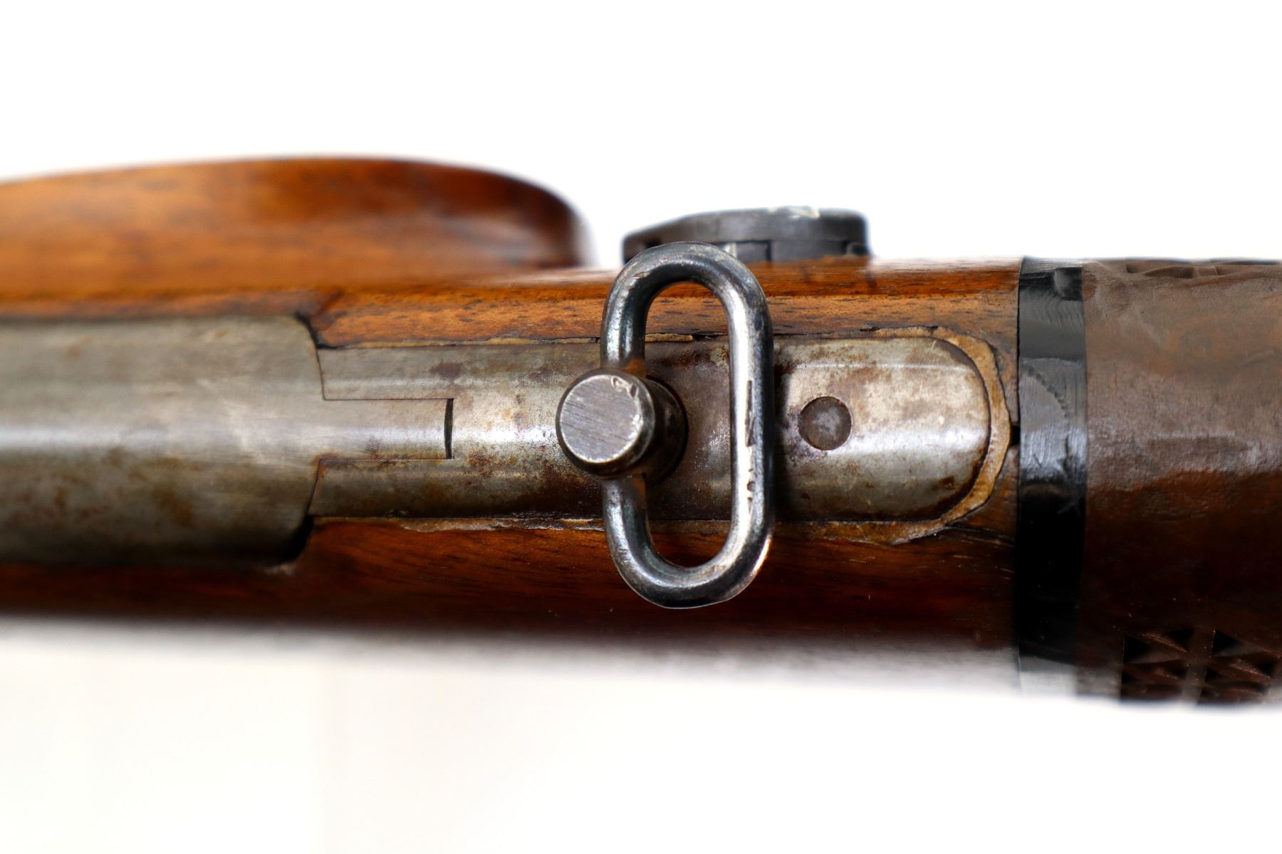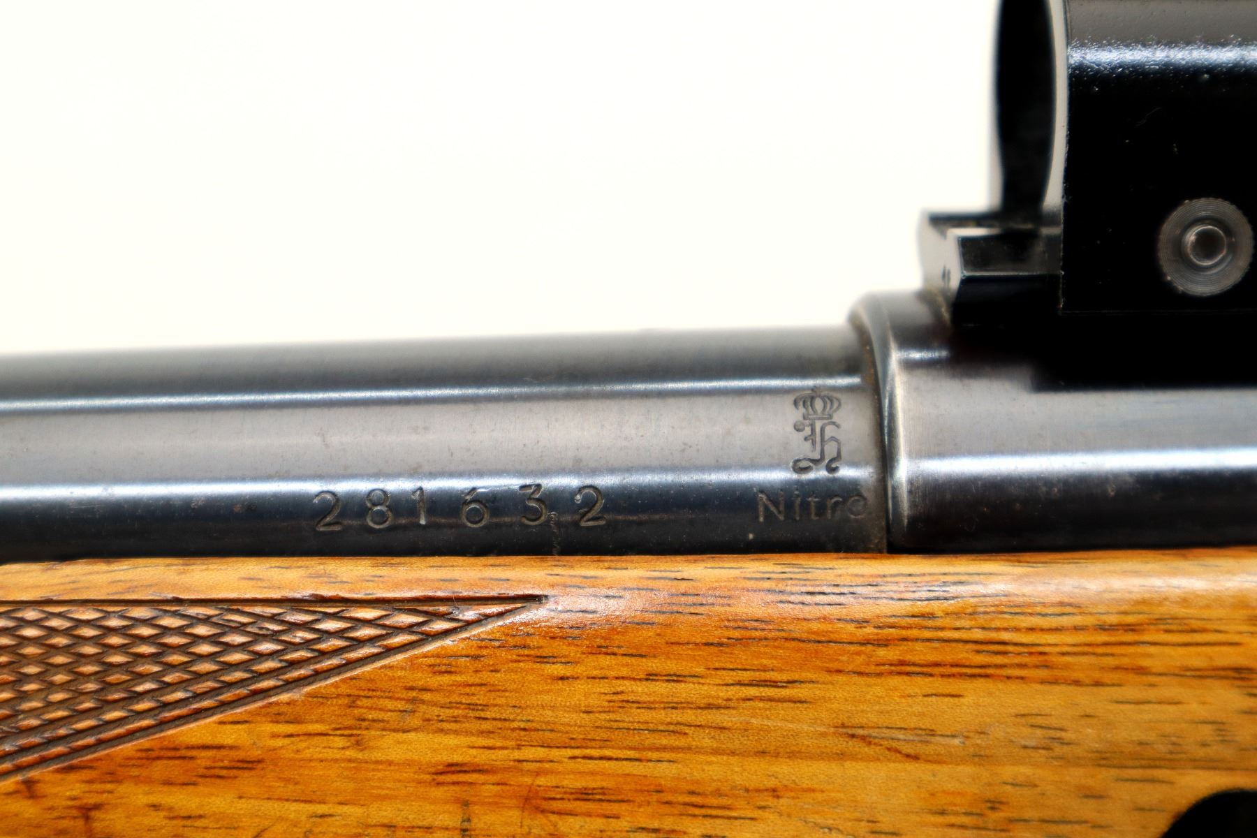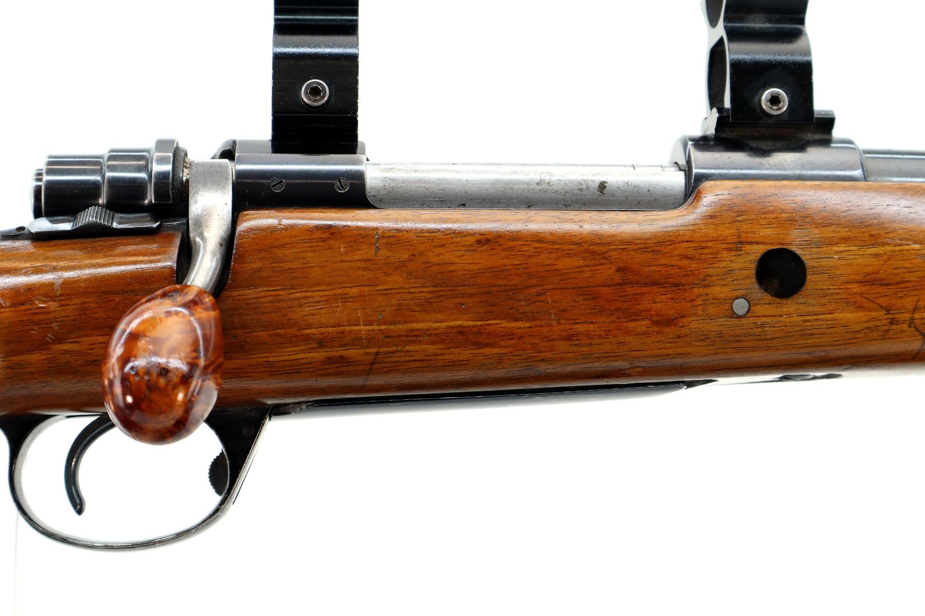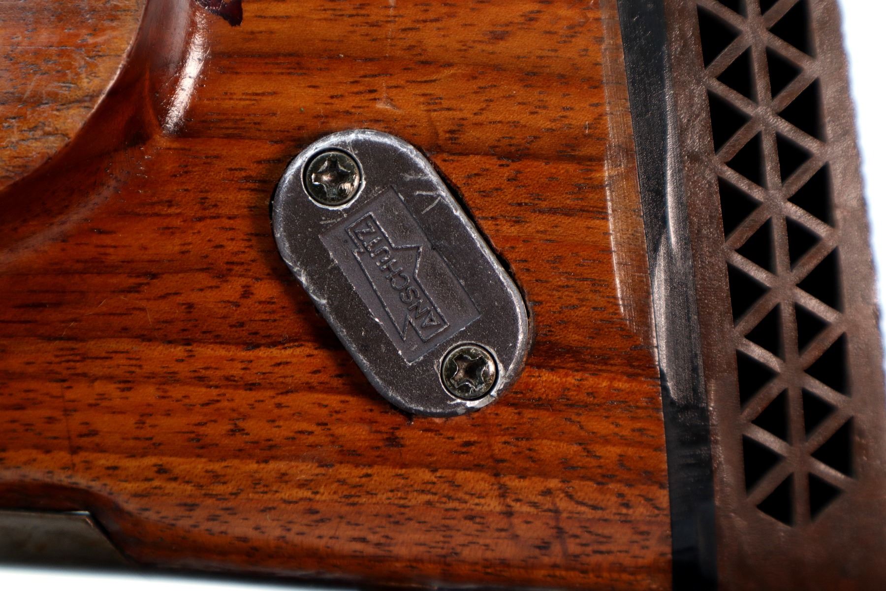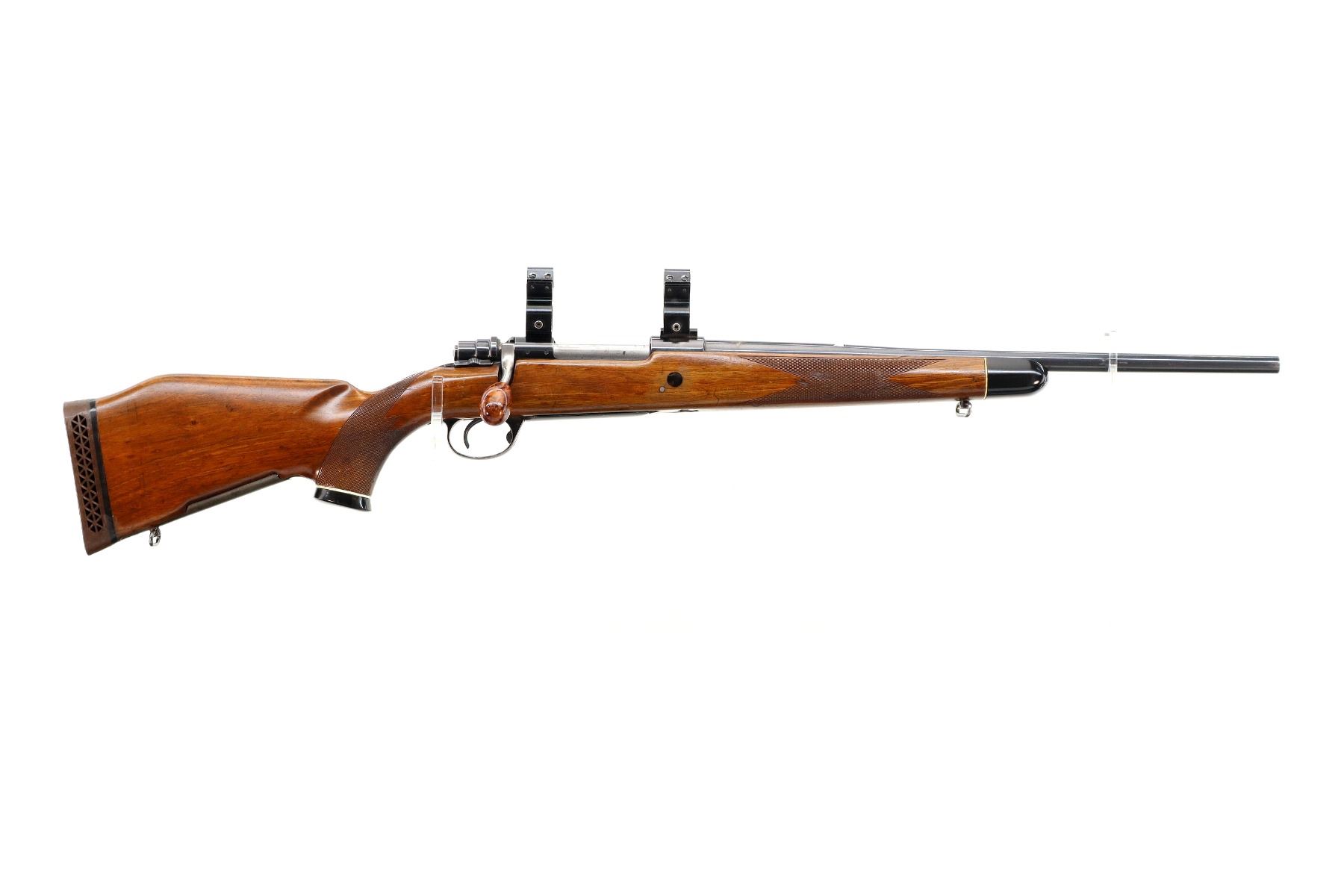 Main Description: Missing front and rear sights, rear dovetail present, blued finish, receiver drilled and tapped with two piece 1" see thru rings installed, large wood bolt knob. One piece wood stock, black polymer forend and pistol grip caps, checkered forearm and pistol grip chipped and cracked behind receiver, cheek rest, brown vented rubber recoil pad, 12.75" LOP, hinged floor plate, four round shell holder in bottom of stock, sling swivels, also has three Anschutz Biathlon sling points installed