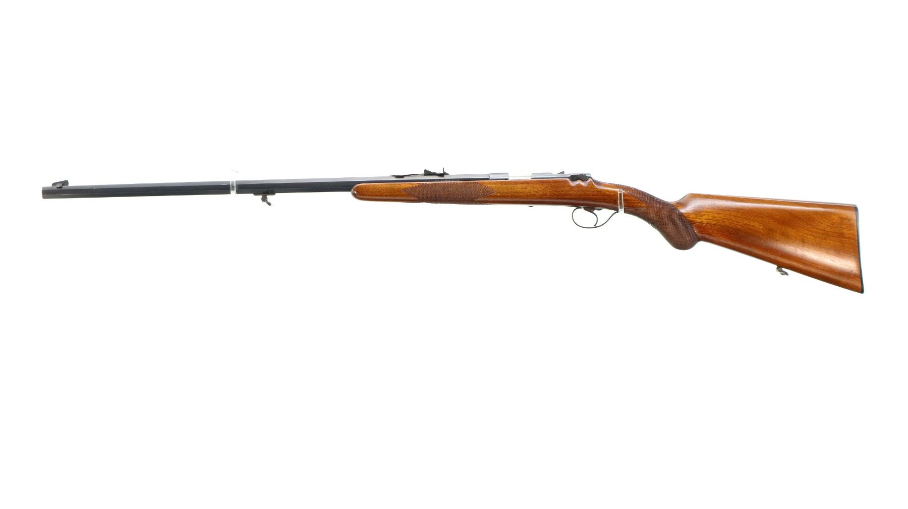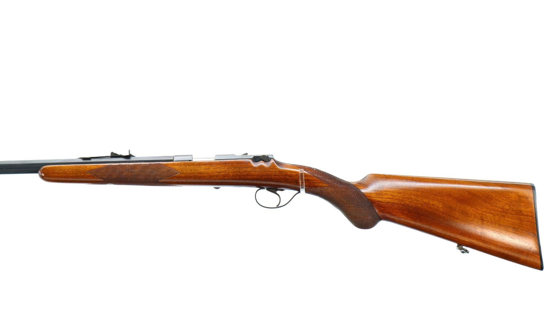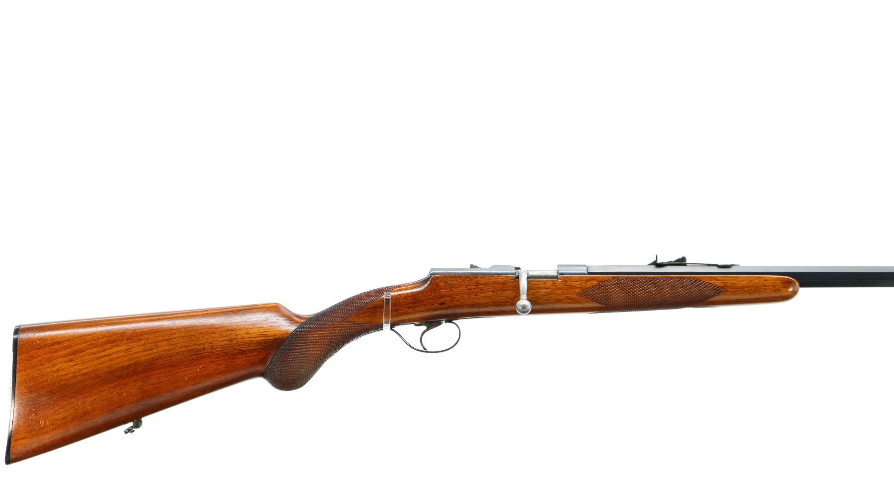 Main Description: Blade front sight, adjustable u notched rear sight, blued finish, turned down bolt handle, missing extractor. One piece wood stock, checkered forearm and pistol grip, grooved black polymer butt plate, sling swivels.