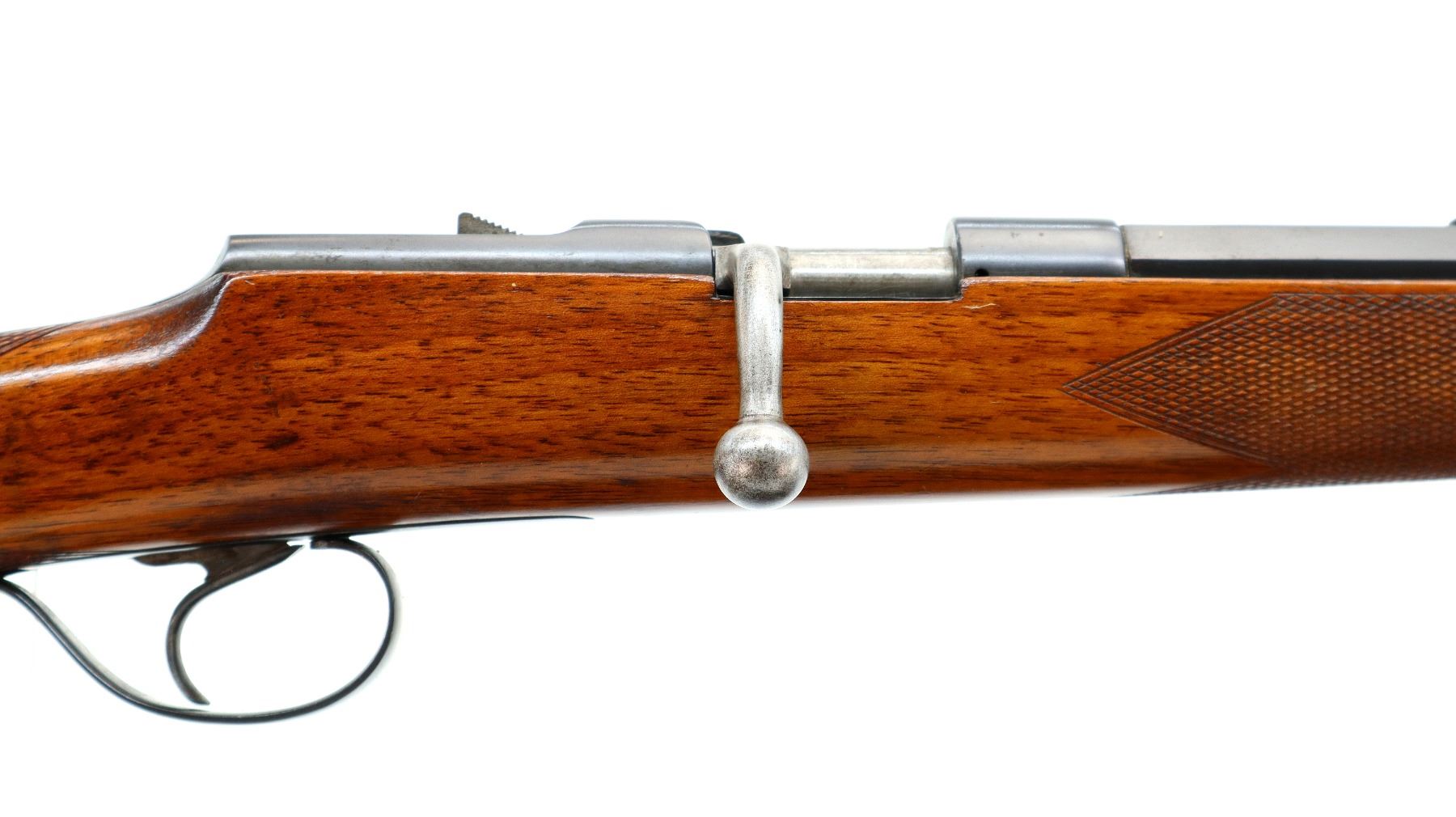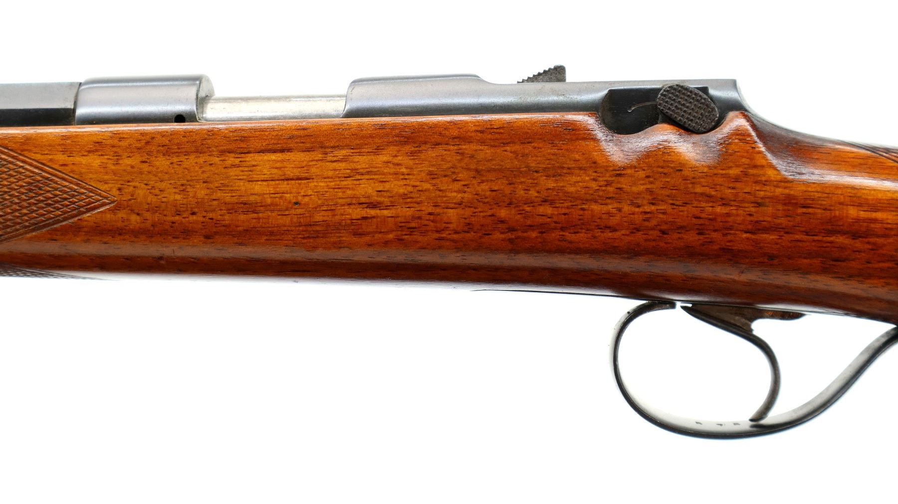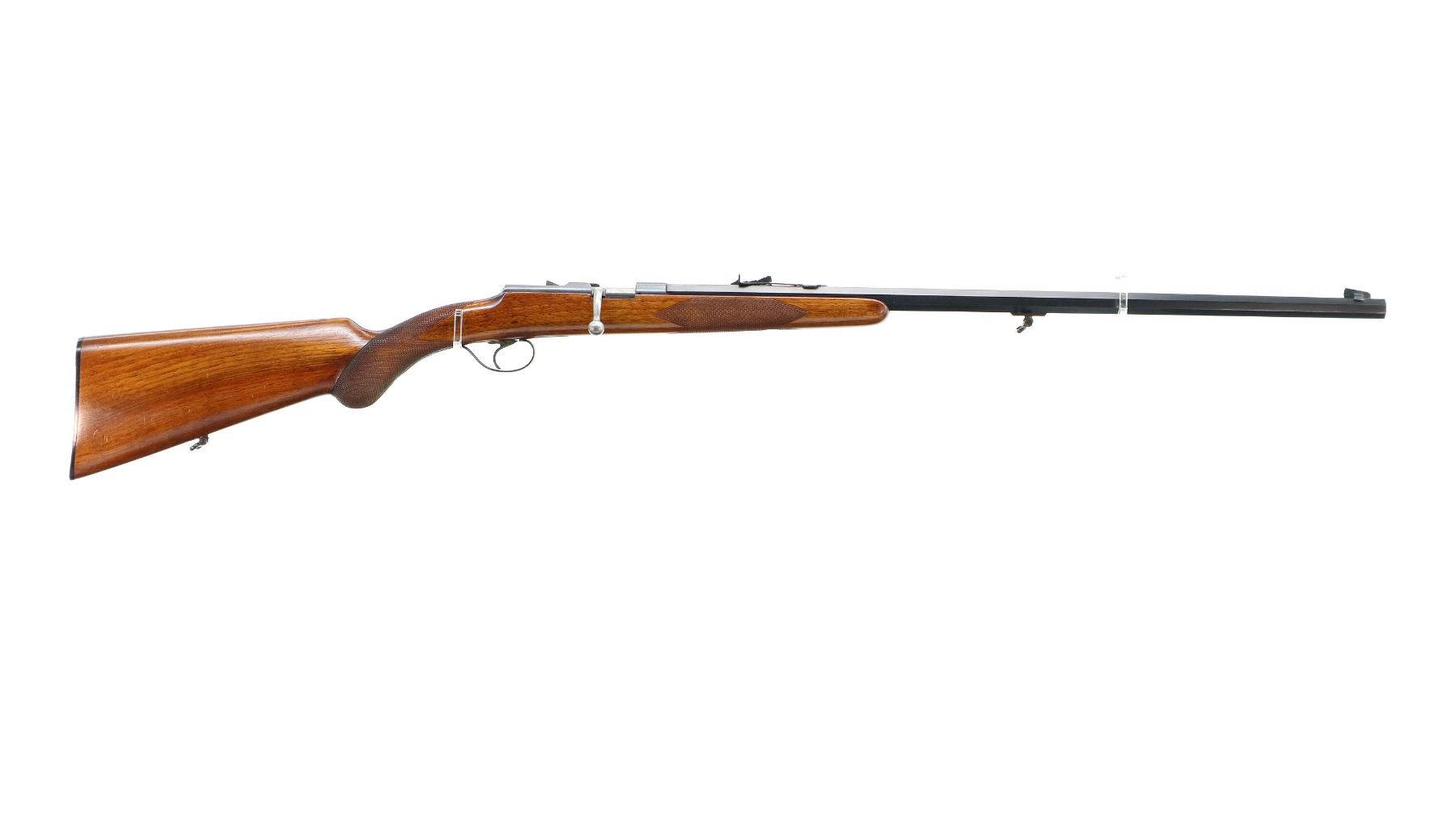 Main Description: Blade front sight, adjustable u notched rear sight, blued finish, turned down bolt handle, missing extractor. One piece wood stock, checkered forearm and pistol grip, grooved black polymer butt plate, sling swivels.