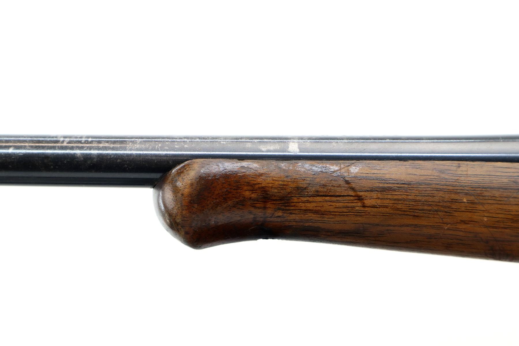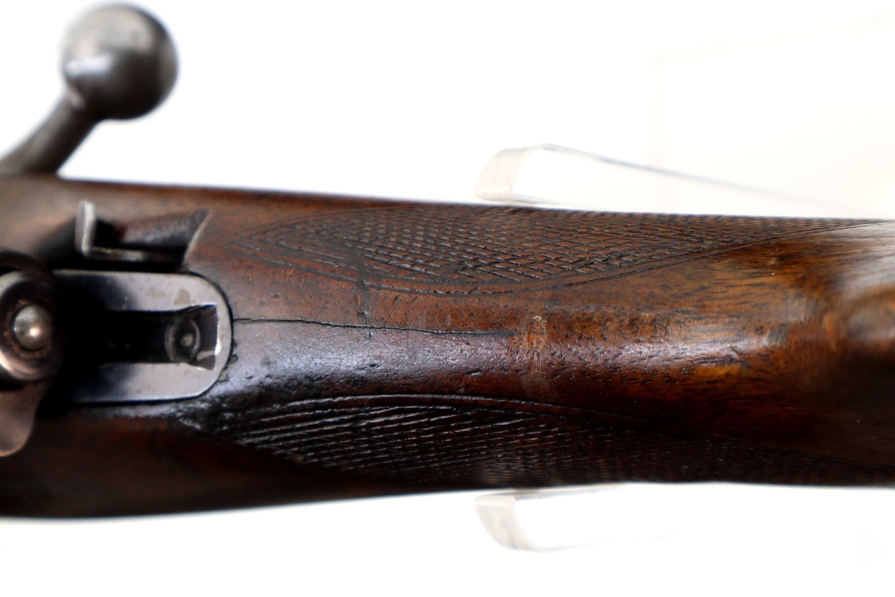 Main Description: Blade front sight with ramp, u notched rear sight, blued finish, receiver drilled and tapped with two piece scope bases installed, smooth bolt knob. One piece wood stock, Schnabel forend tip, checkered pistol grip cracked behind receiver, grooved black polymer butt plate, 13.75" LOP, grip cap, has a rear swivel missing the front hole is present.