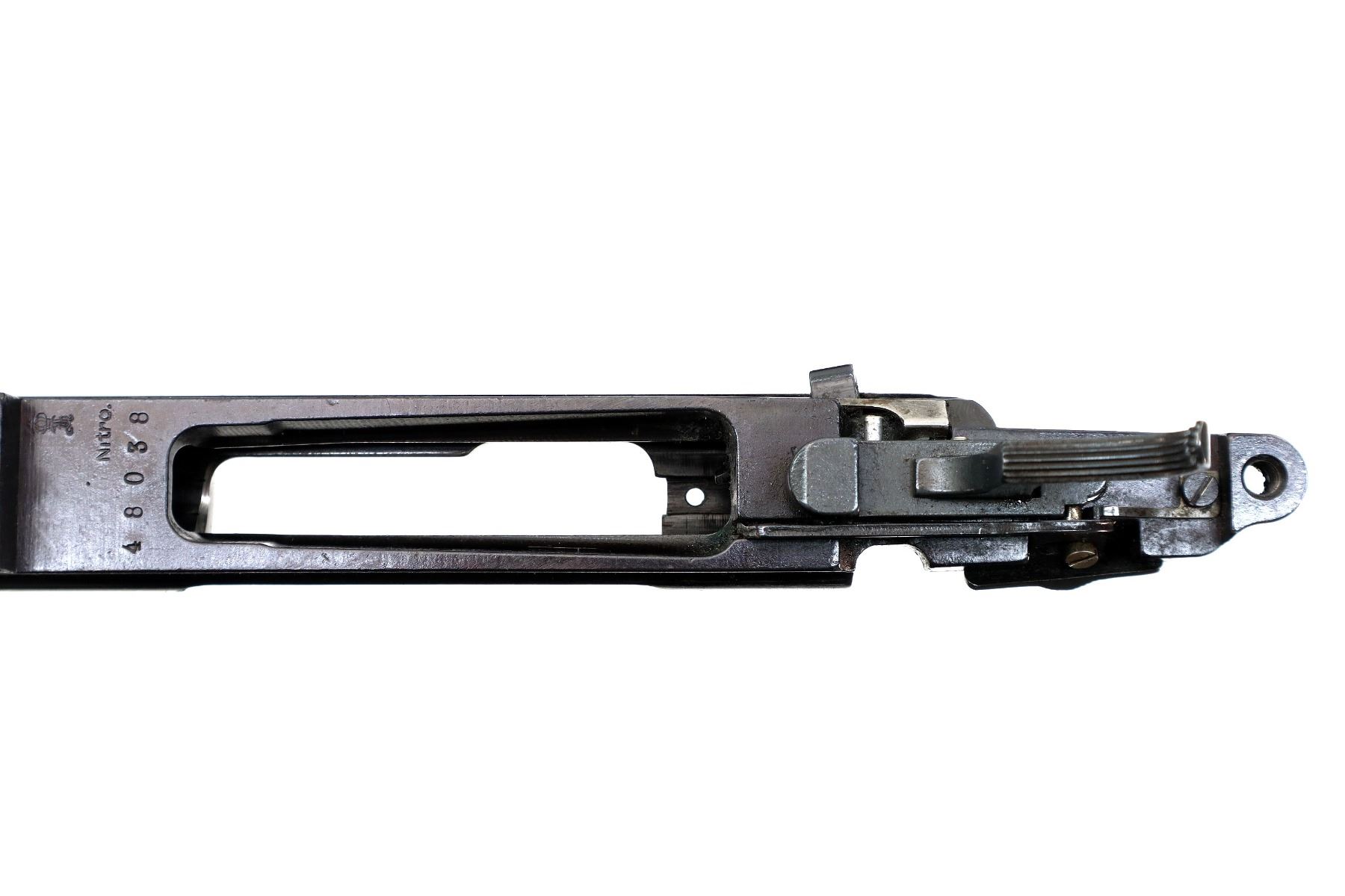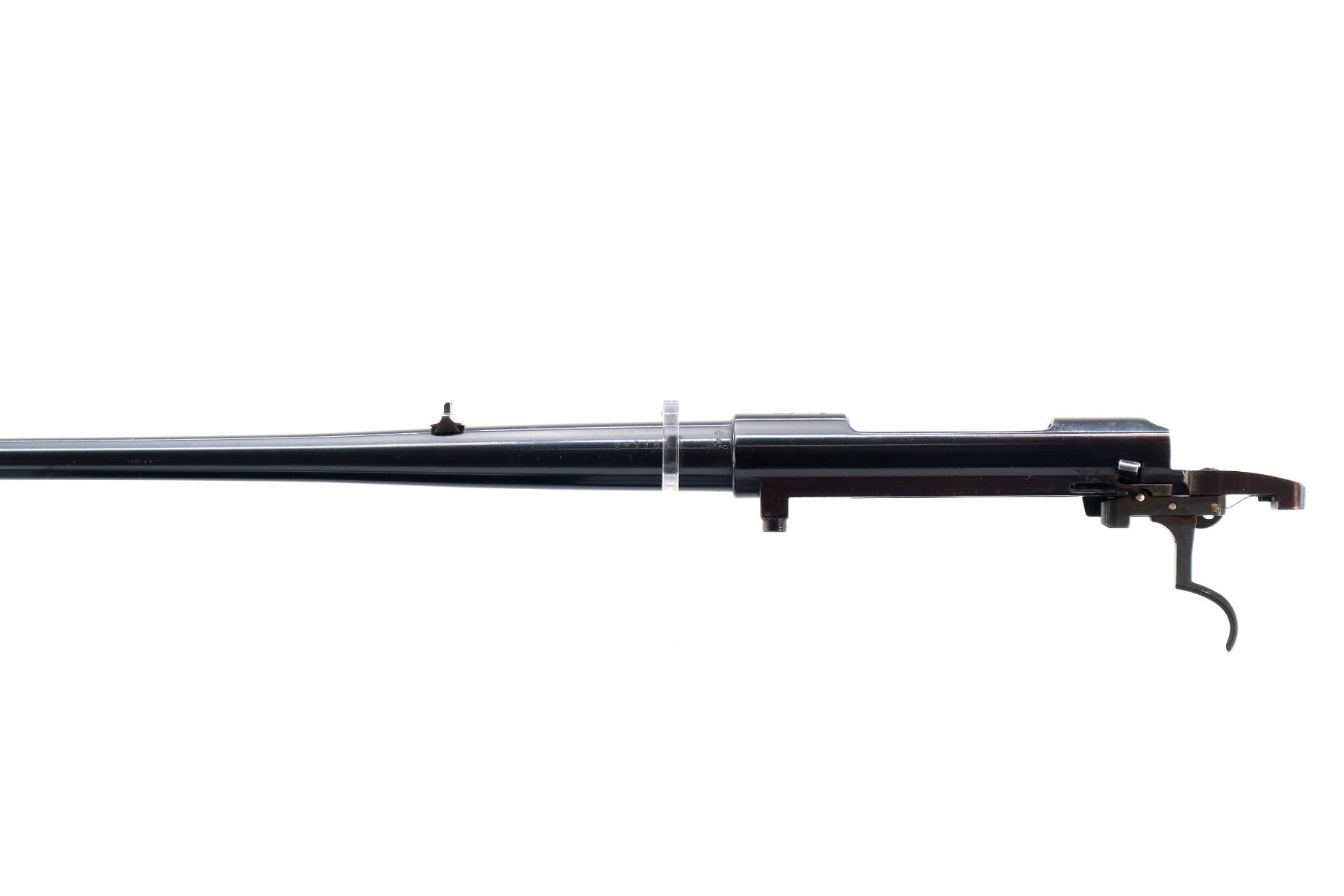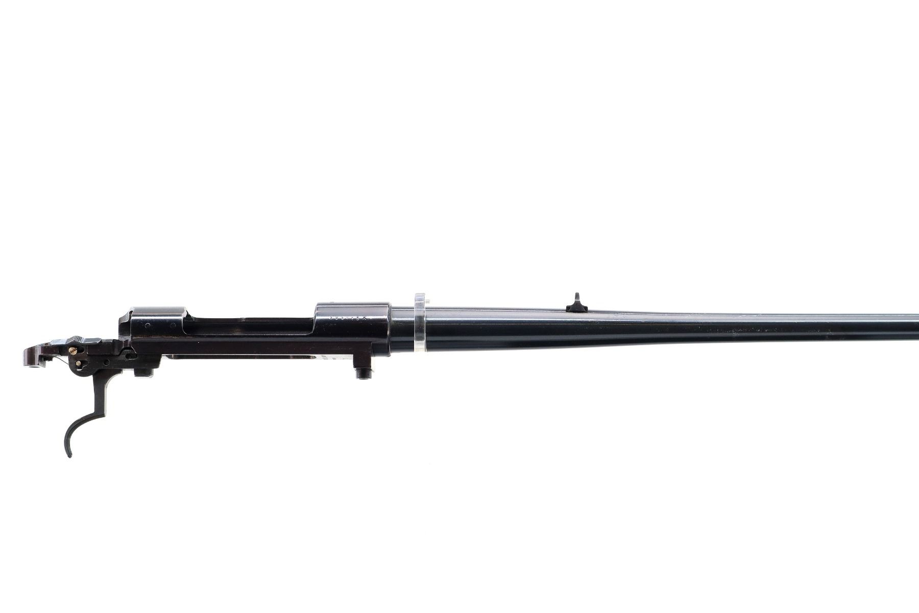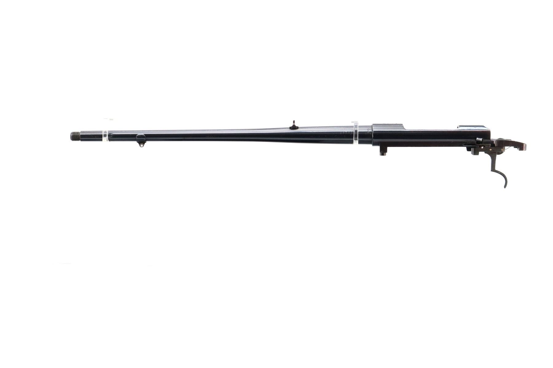 Main Description: No front sight, u notched rear sight, blued finish, threaded muzzle with no cap, receiver drilled and tapped with no plug screws installed, includes trigger and bolt stop assembly's, front swivel stud. No other parts or stock included.