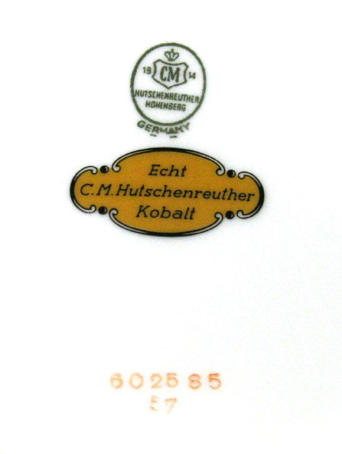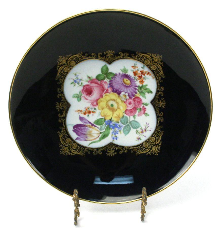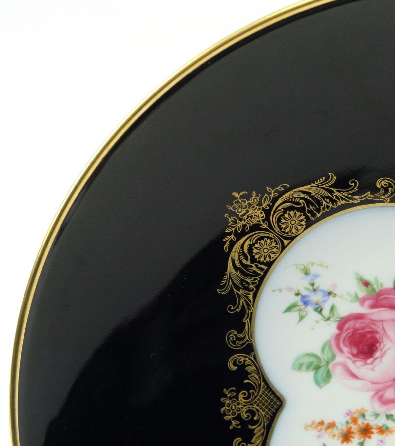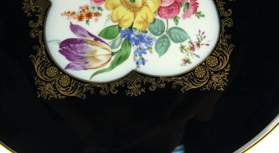 A beautiful shallow fruit bowl with floral transfer pattern and gilt motif on cobalt blue field. Properly marked on bottom with CM marks and numbered. 12.5 inch diameter. Excellent condition with no chips, cracks, crazing or repairs.