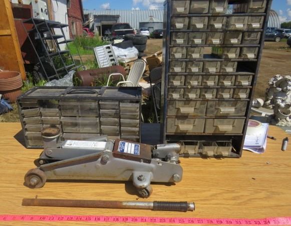 HYDROLIC JACK AND 2 BOXES OF MISC SCREWS, NAILS, ETC