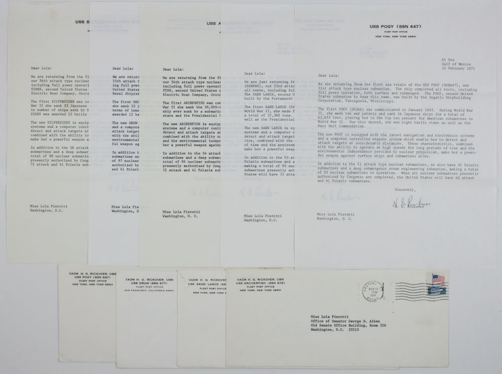 (1900 - 1986) American admiral responsible for the construction of the "Nuclear Navy", starting with the submarine Nautilus. Fine lot of five (5) T.L.S.s, each 1p. 4to. on an official submarine's letterhead, depending on the letter, "At Sea", 1971-72. Rickover was a master of public relations and made it a habit to send multiple letters to important political figures from every new atomic submarine and ship he commissioned as it returned from sea trials. Each of these letters, all typed and hand-signed, was sent to an associate of powerful Vermont Sen. George D. Aiken. Every letter describes the vessel's successful sea trials, the history of its namesake vessel, describes features of the newest vessel, and concludes with a summary of the strength of America's submarine fleet. Vessels described here include the USS SILVERSIDES, POGY, DRUM, ARCHERFISH, and SAND LANCE. Overall fine condition, most with transmittal envelopes.