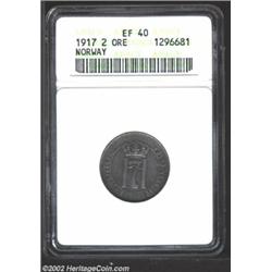Haakon VII Iron 2 Ore 1917, KM371a, XF40 ANACS. A scarce date, and attractive without rust marks. Important notice: We expect to be auctioning lots at the rate of 200-250 per hour. Sometimes eBay Premier live bid software cannot keep up with that pace, so we strongly recommend that you place a realistic proxy bid now as insurance to avoid disappointment. Also please note that all Heritage/CAA lots purchased through eBay Premier carry a 20% Buyer's Premium. Please make sure you read the Terms and Conditions.