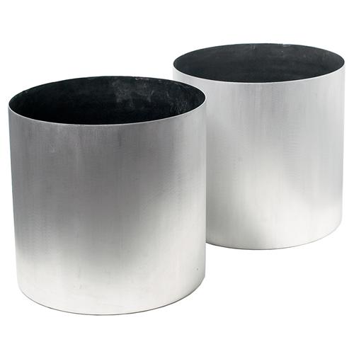 Habitat International planters, pair, aluminum with brushed finish, labeled "Architectural Supplements Habitat and Habitat International", 16"dia. x 15"h, very good condition
