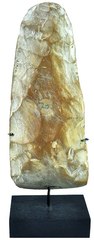 Hacha. Sílex. Neolítico final o inicios del Periodo Pre-dinástico (6.000-3.500 a.C.). Excavado por Robert Rustafjaell en 1909 en Saqqara, Egipto. Comprado en una de las subastas realizadas en 1913 y 1915 por Gustave Maurice Heckscher y posteriormente donado al museo fundado por su padre. Descatalogado del Heckscher Museum of Art, Nueva York, en 2012. Altura 16,5 cm. Presenta números de inventario del museo. Incluye soporte.