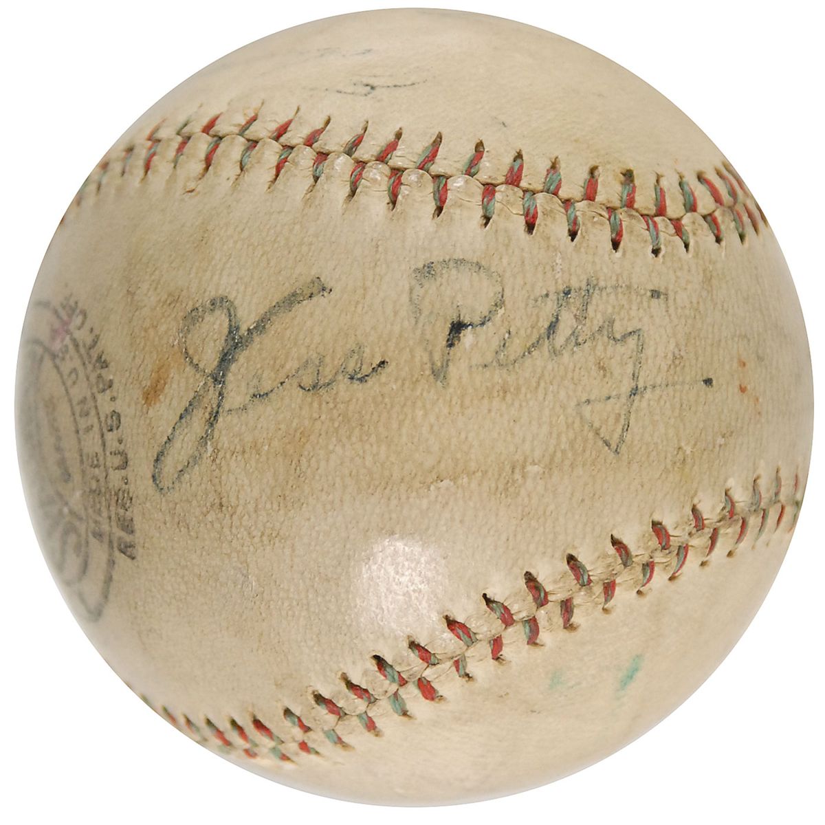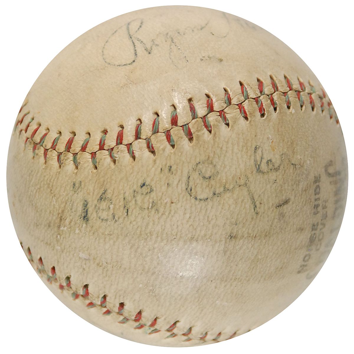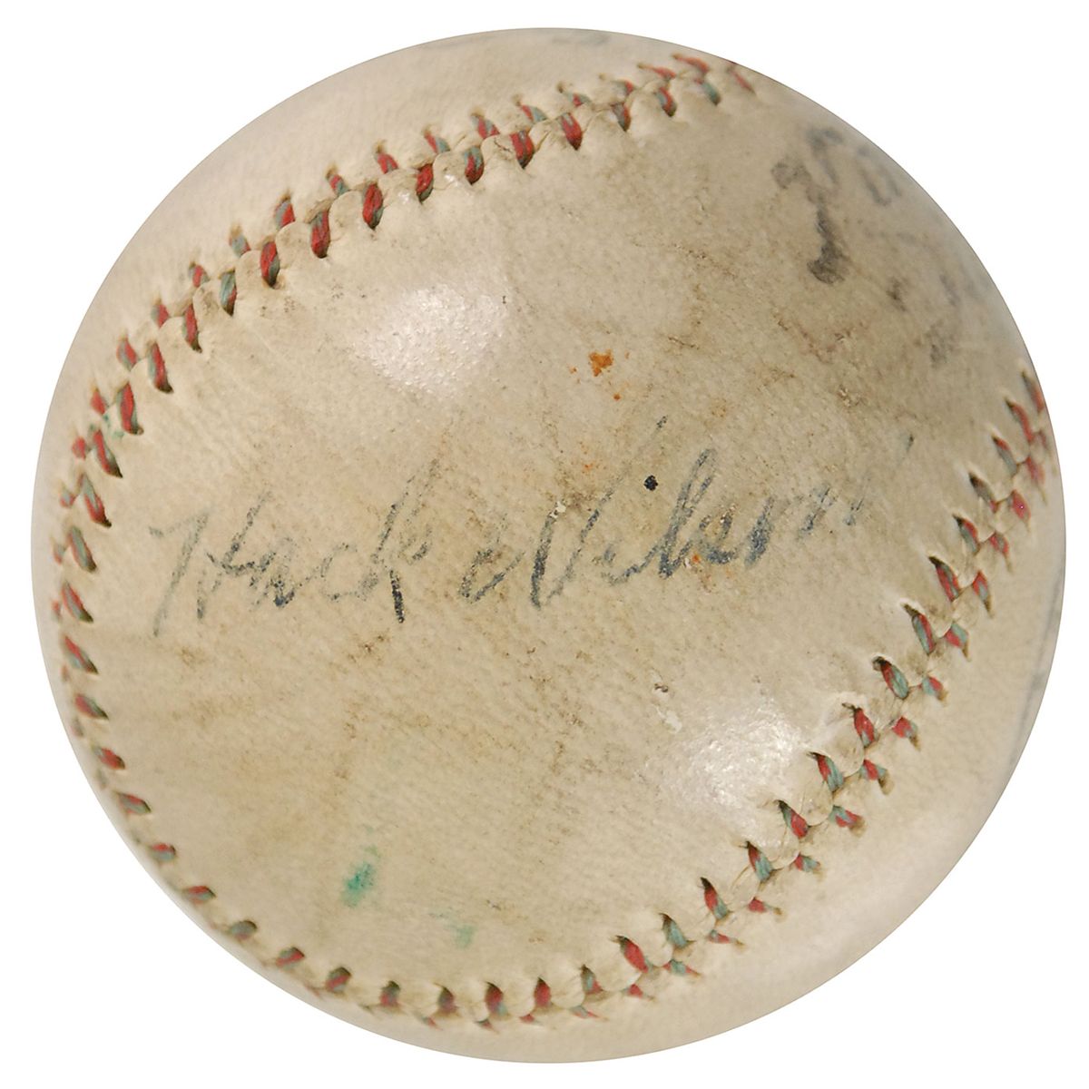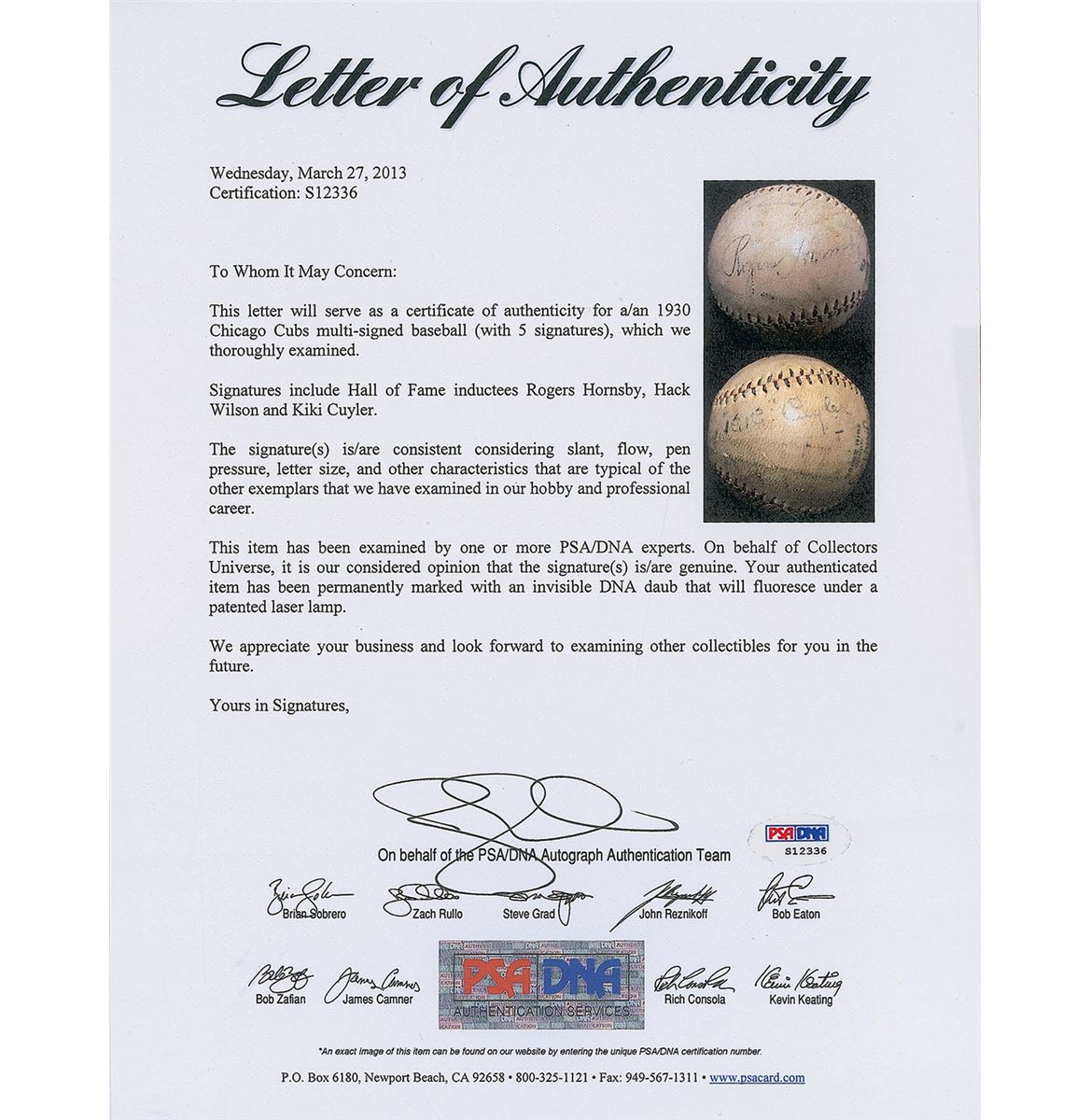 Official Spalding ‘King of the Diamond’ baseball signed in fountain pen on the sweet spot and side panels by five members of the 1930–1931 Chicago Cubs team, including: Hack Wilson, Rogers Hornsby, Kiki Cuyler, Jesse Petty, and Edward Baecht. In very good condition, with scattered surface marks and scuffs, and signatures a couple shades light, with Wilson’s being the strongest. Accompanied by a full letter of authenticity from PSA/DNA. The inclusion of Petty and Baecht dates this baseball to spring training before the 1931 season, as this was the only time their tenures in Chicago overlapped. Hack Wilson was coming off the 1930 season in which he recorded 191 RBI, a count that remains unsurpassed. These Hall of Famers are difficult to find on baseballs and the Wilson and Cuyler signatures were granted their own panels, making this an especially ideal example for ‘single-signed’ display.