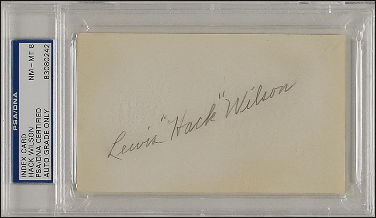 Hall of Famer who won four home run titles while with the Cubs. His 1930 season still inspires awe with 191 RBIs (the all-time major league record), 56 home runs (a National League record for 68 years) and a .356 batting average. Vintage pencil signature, “Lewis ‘Hack’ Wilson,” on an off-white 5 x 3 card. Encapsulated in a plastic PSA/DNA authentication holder, grading the signature NM-MT 8. In fine condition, with some toning around the edges.