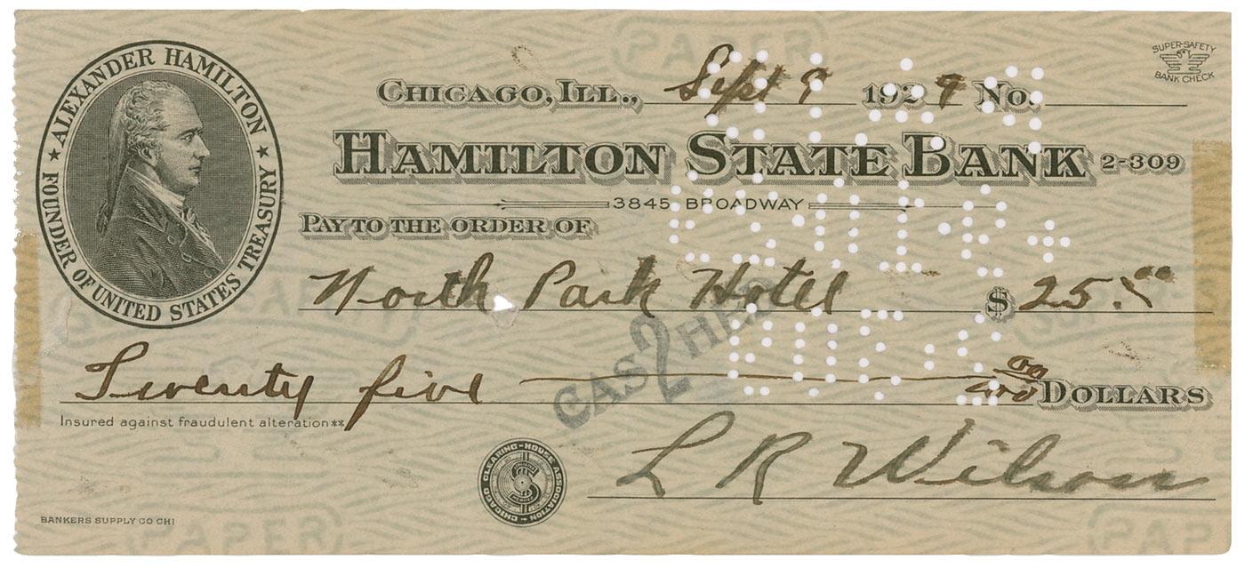 Hall of Famer who won four home run titles while with the Cubs. In 1929, Wilson hit .345 with 39 home runs and set a National League single-season record with 159 RBIs—a record he would break in historic fashion the following year. Bank check, 6 x 2.75, filled out in another hand and signed by Wilson, “L. R. Wilson,” payable to North Park Hotel for $25.00, September 9, 1929. Central vertical fold, expected stamps and cancellation holes to body, slight feathering to signature, and tape remnant to right edge, otherwise fine condition. Wilson is quite uncommon in autographed material. Accompanied by a letter of authenticity from James Spence.