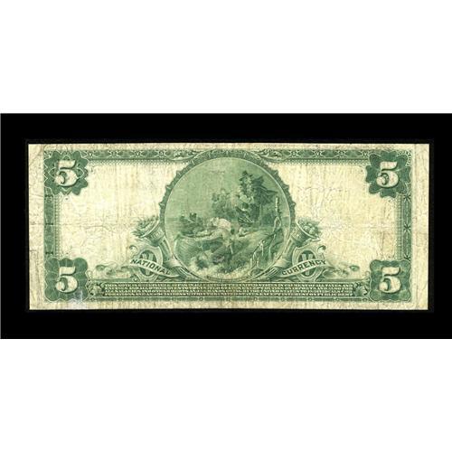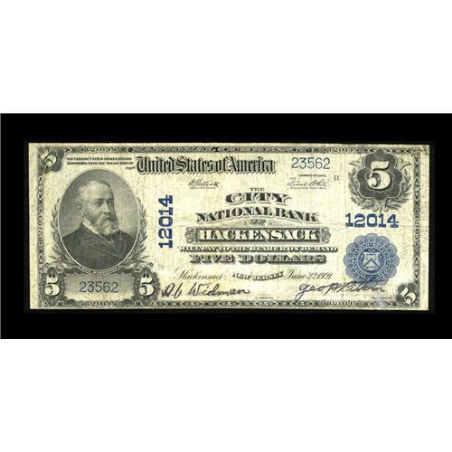 <B>Hackensack, NJ</B></I> - $5 1902 Plain Back Fr. 608 <B>The City NB</B></I> Ch. # 12014<BR>This $5 has retraced signatures and a small tear under the president's signature has been repaired. <B>Fine.</B></I>