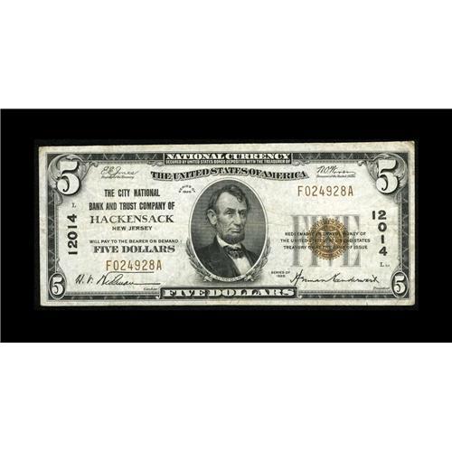<B>Hackensack, NJ</B></I> - $5 1929 Ty. 1 <B>The City NB & TC</B></I> Ch. # 12014<BR>Bright for the grade and nicely margined. <B>Fine.</B></I>