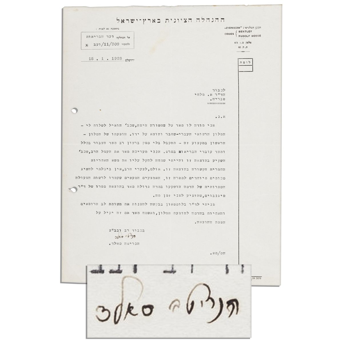 Henrietta Szold typed letter signed [in Hebrew] ''Henrietta Szold''. Letter typed in Hebrew is dated 15 January 1928. The founder of Hadassah, a medical outreach organization staffed by American Jewish women, Szold rescued thousands of children from the Nazis. Single-page letter measures 8.5'' x 11''. Filing holes on the left margin, modest handling wear, and the usual folds, else near fine.