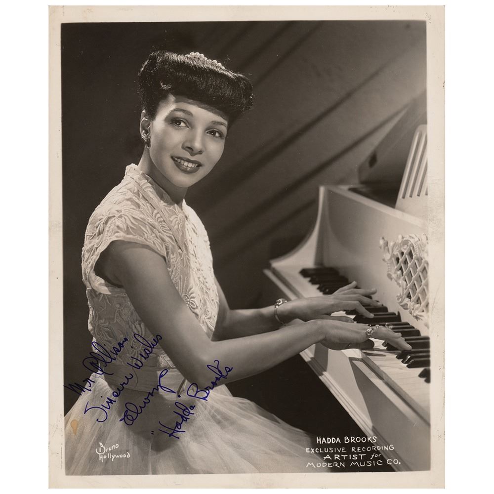 Vintage glossy 8 x 10 photo of Brooks at her piano, signed and inscribed in fountain pen, "Mr. Allison, Sincere Wishes Always, Hadda Brooks.†In very good to fine condition, with some light creasing, one small stain, and a name curiously written in ballpoint in an unknown hand beneath the recipient's name.