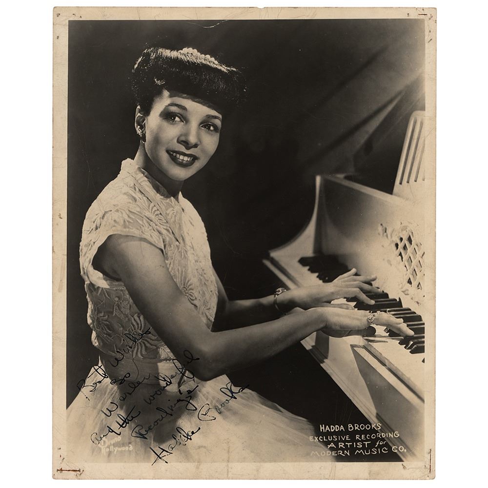 Pianist, vocalist, and composer (1916–2002) billed as 'Queen of the Boogie.' Vintage glossy 8 x 10 photo of Brooks at her piano, signed and inscribed in fountain pen, "Best wishes to Werley and the wonderful recordings, Hadda Brooke.” In very good condition, with heavy overall creasing, and staple holes to the corners.