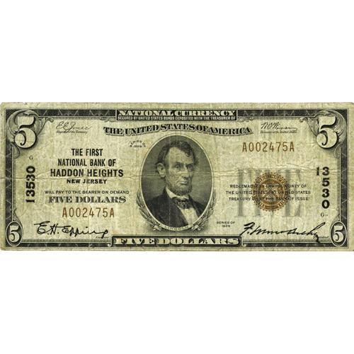 <B>Haddon Heights, NJ</B></I> - $5 1929 Ty. 1 <B>The First NB</B></I> Ch. # 13530<BR>Of the two National Banks that operated in Haddon Heights, only this one issued small size notes. This issue is popular not only for its one-bank-town status, but also the font on the title, which was used on very few issues throughout the country. <B>Fine.</B></I>