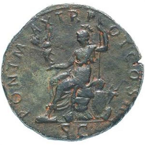 Roman Empire Coins. Hadrian (117-138). Sestertius. D/ IMP CAESAR TRAIANVS HADRIANVS AVG. Busto laureato e drappeggiato a destra. R/ PONT MAX TR POT COS III SC. Roma, seduta a sinistra su corazza, tiene Vittoria e lancia. Dietro, armi. RIC 562b. gr. 24.98 AE. Bel BB+. Esemplare molto attraente, di grande modulo, con bella patina verde oliva. Intatto.