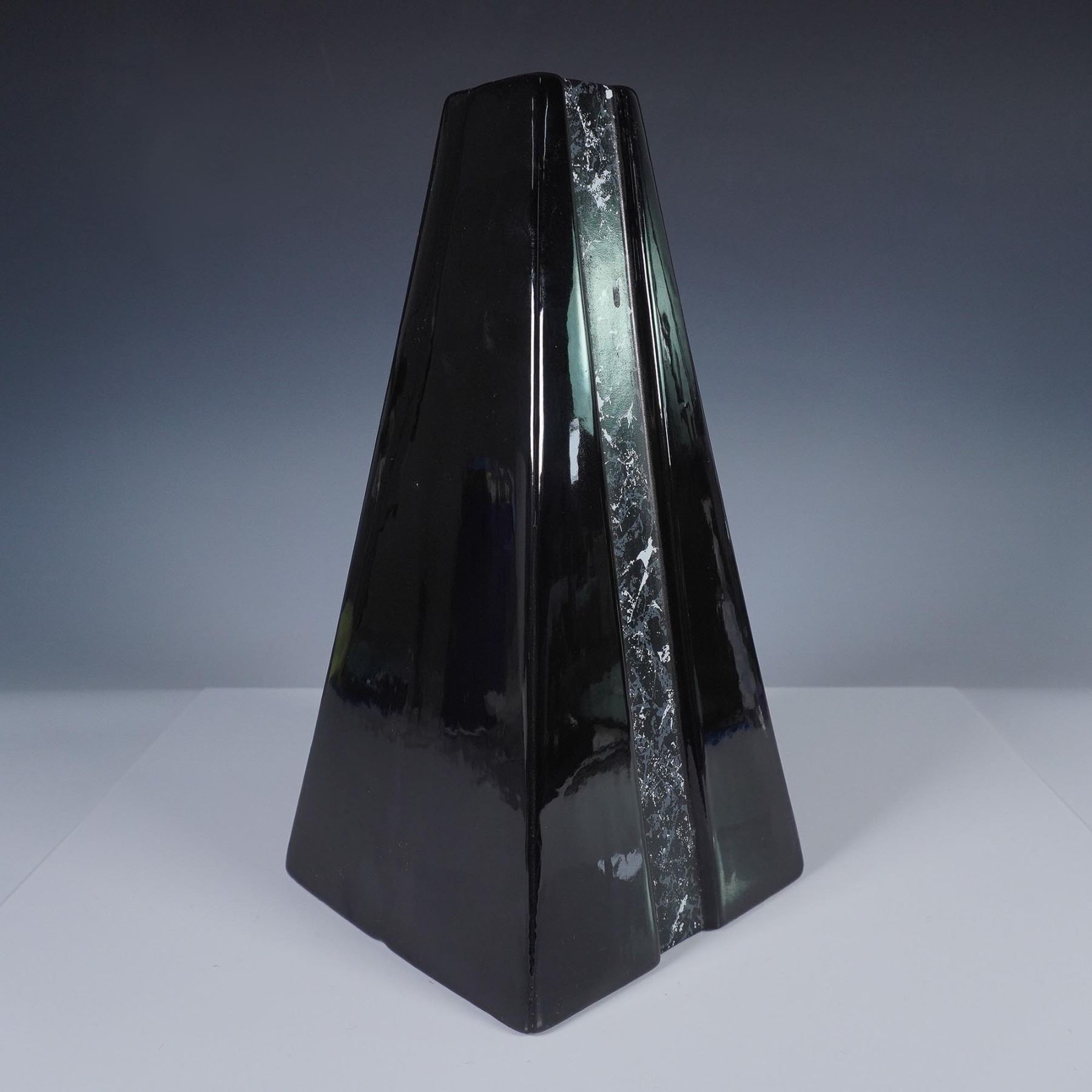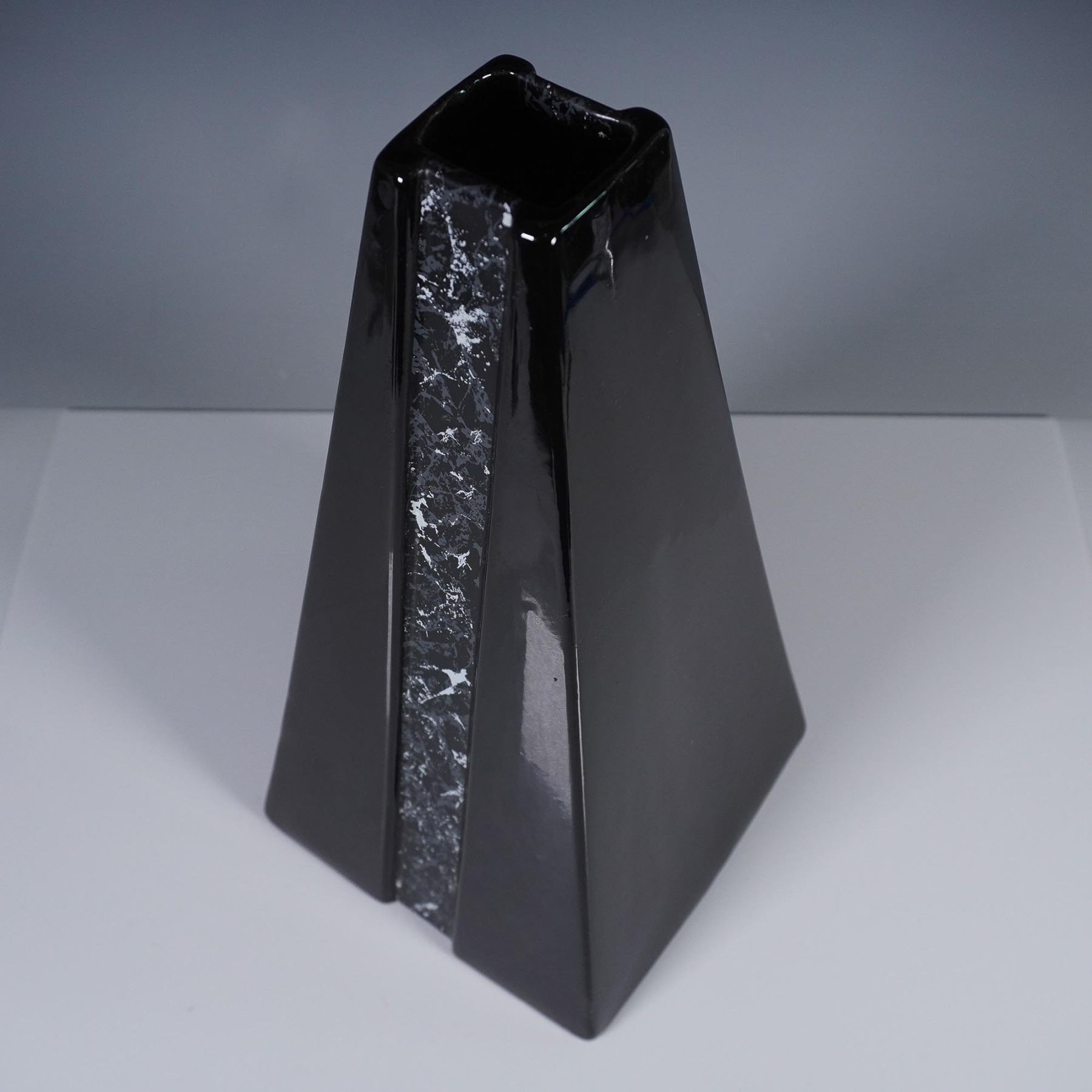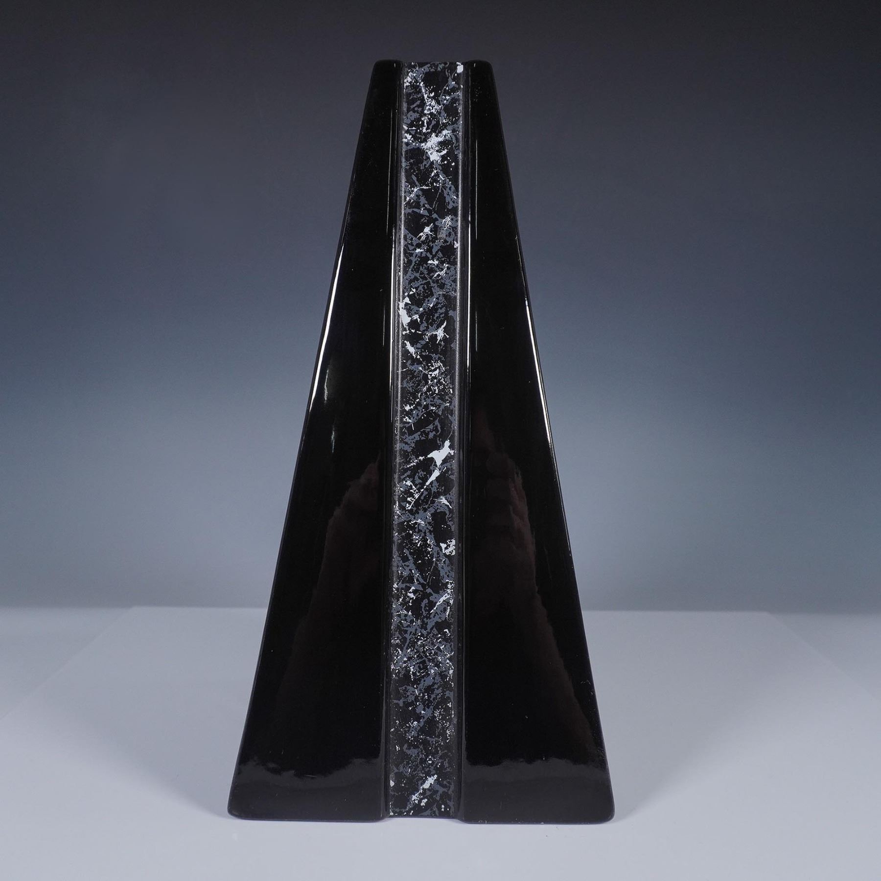 Striking modernist obelisk-shaped ceramic vase by Haeger, model 4400, featuring a glossy black glaze with a central textured marbled accent running vertically along each side. American made and dated 1985, this sculptural piece exemplifies the bold, geometric aesthetic Haeger became known for in the late 20th century. The original Haeger sticker is still affixed to the base.