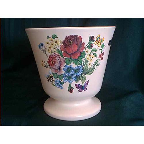 Planter vase by Haeger is off white color with flowers, bees, and butterflies. The planter is marked "The Great Name Haeger in American Ceramics" and measures approx. 8 inches high and 8 inches wide and is in very good condition with no chips or cracks.