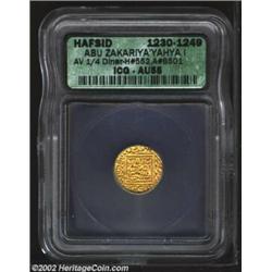 Hafsid Dynasty Gold 1/4 Dinar 1230-1249AD, Abu Zakariya Yahya I, without mint name but usually Tunis. AU55 ICG. An absolutely superb example of this early coinage with bold details and full mint bloom. Extremely rare. Important notice: We expect to be auctioning lots at the rate of 200-250 per hour. Sometimes eBay Premier live bid software cannot keep up with that pace, so we strongly recommend that you place a realistic proxy bid now as insurance to avoid disappointment. Also please note that all Heritage/CAA lots purchased through eBay Premier carry a 20% Buyer's Premium. Please make sure you read the Terms and Conditions.