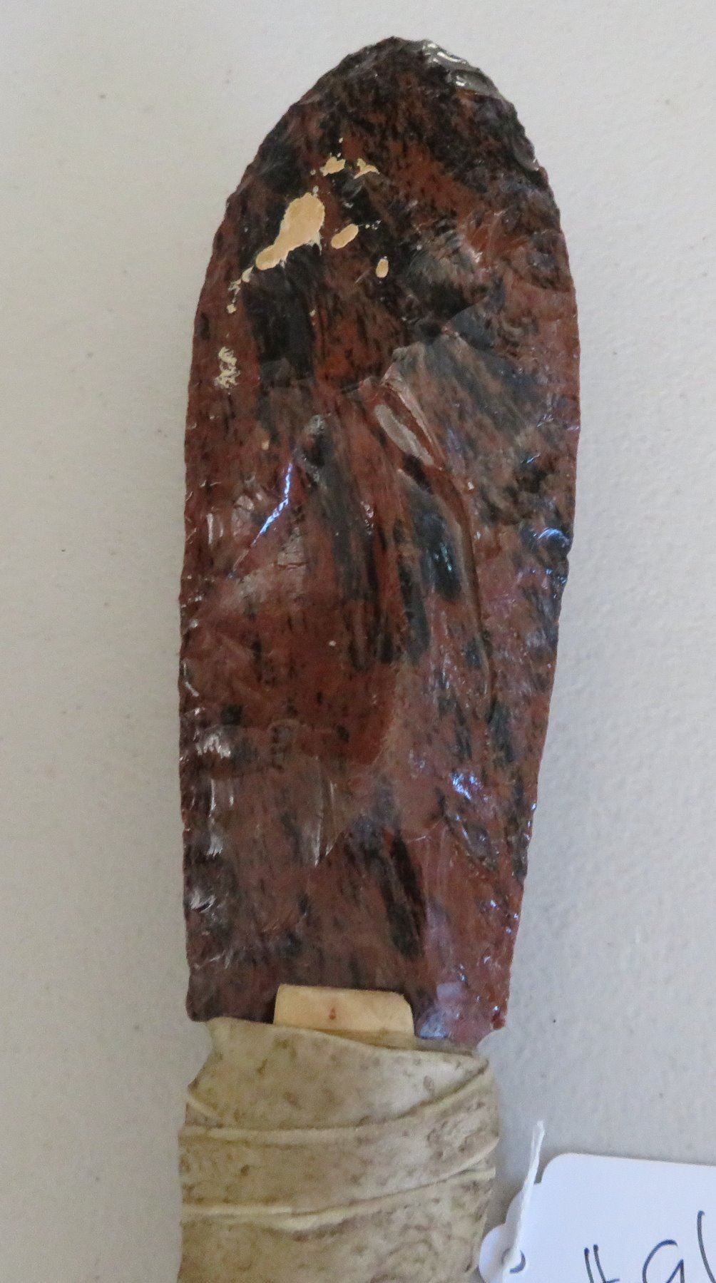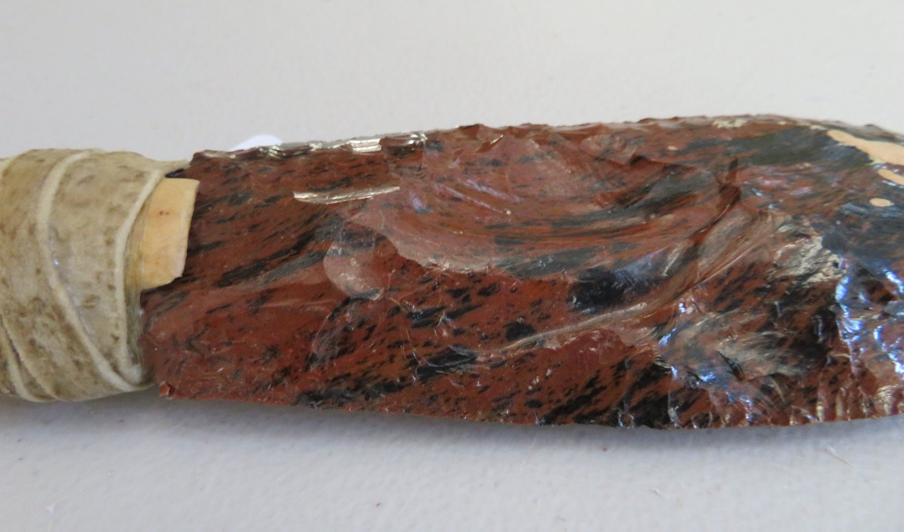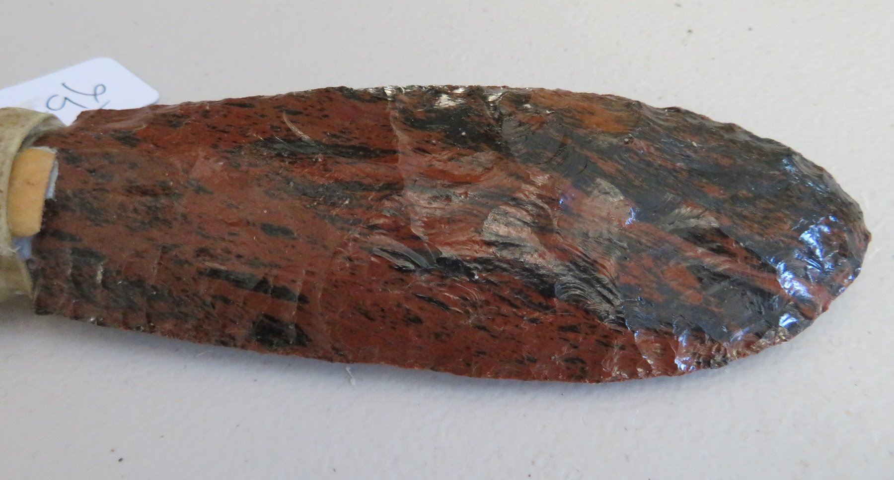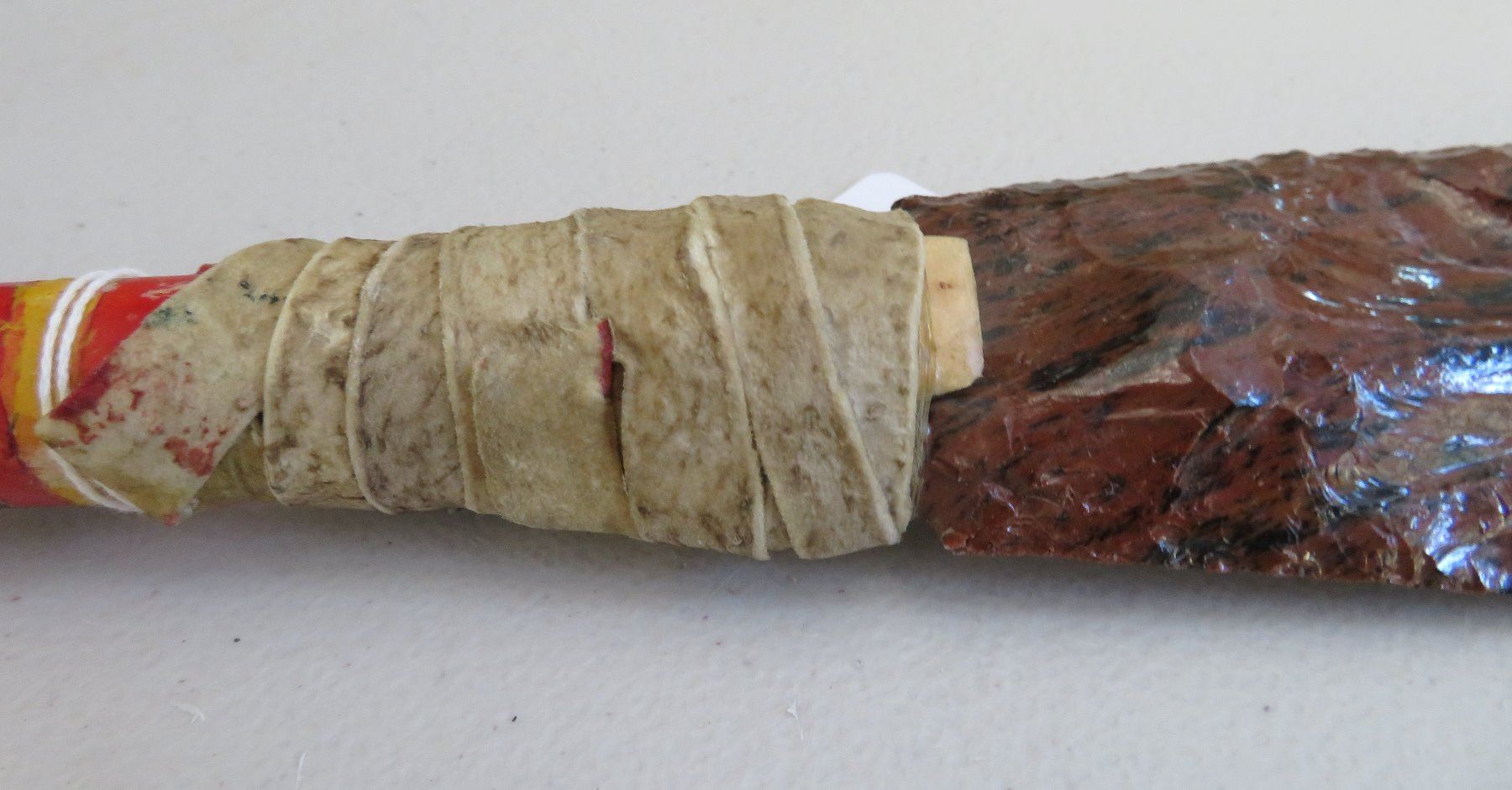 Hafted Hupa Obsidian Knife, c. 1900. Made of mahogany obsidian, leather and wool, the item measures overall 20" and the blade 7". Central California. Condition: Good, see images. Shipping: $34.50 w/insurance and signature, due to length.