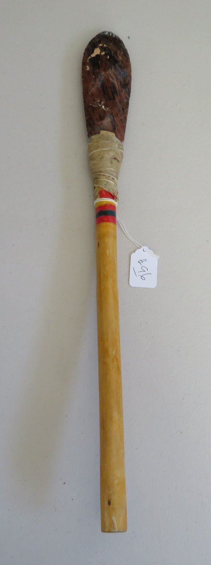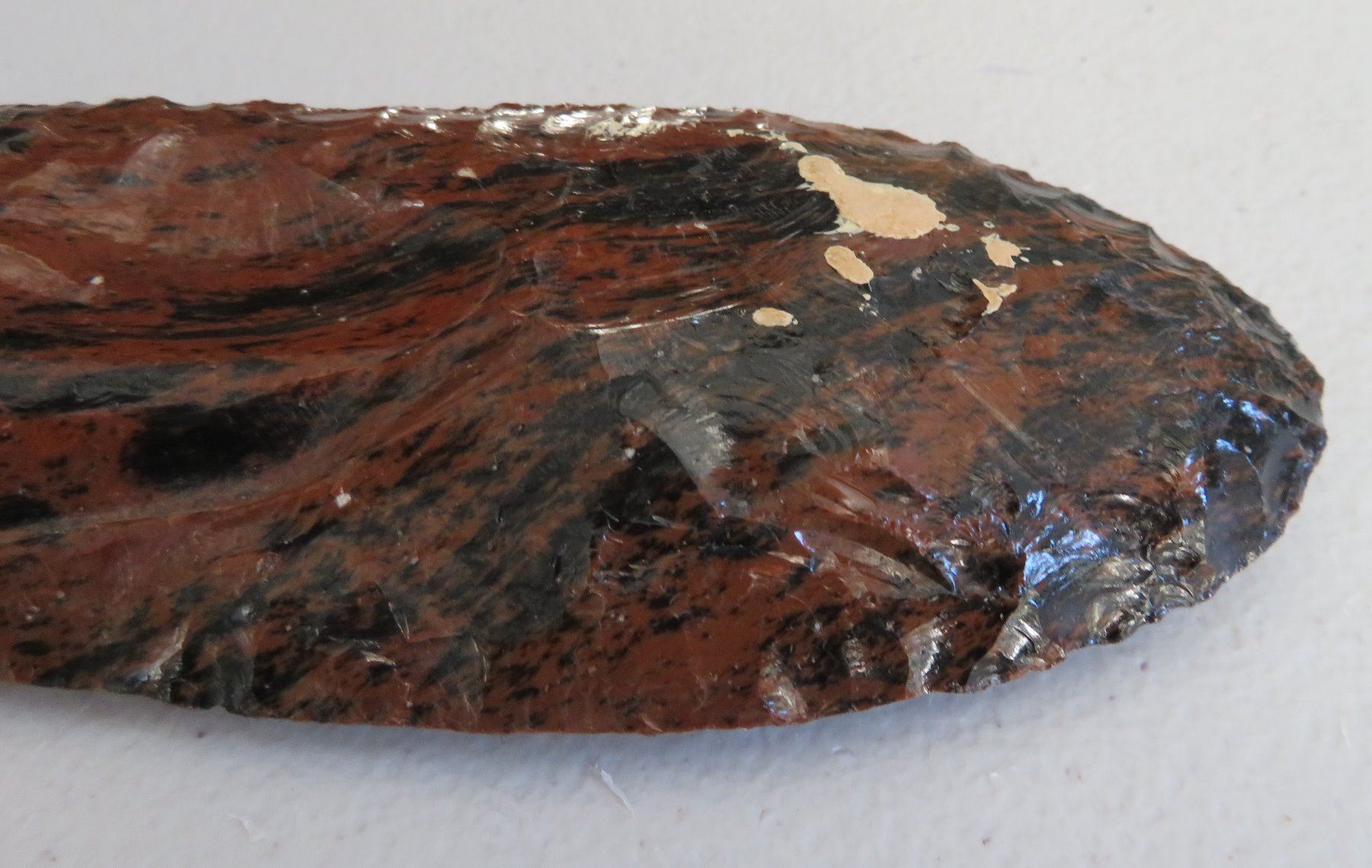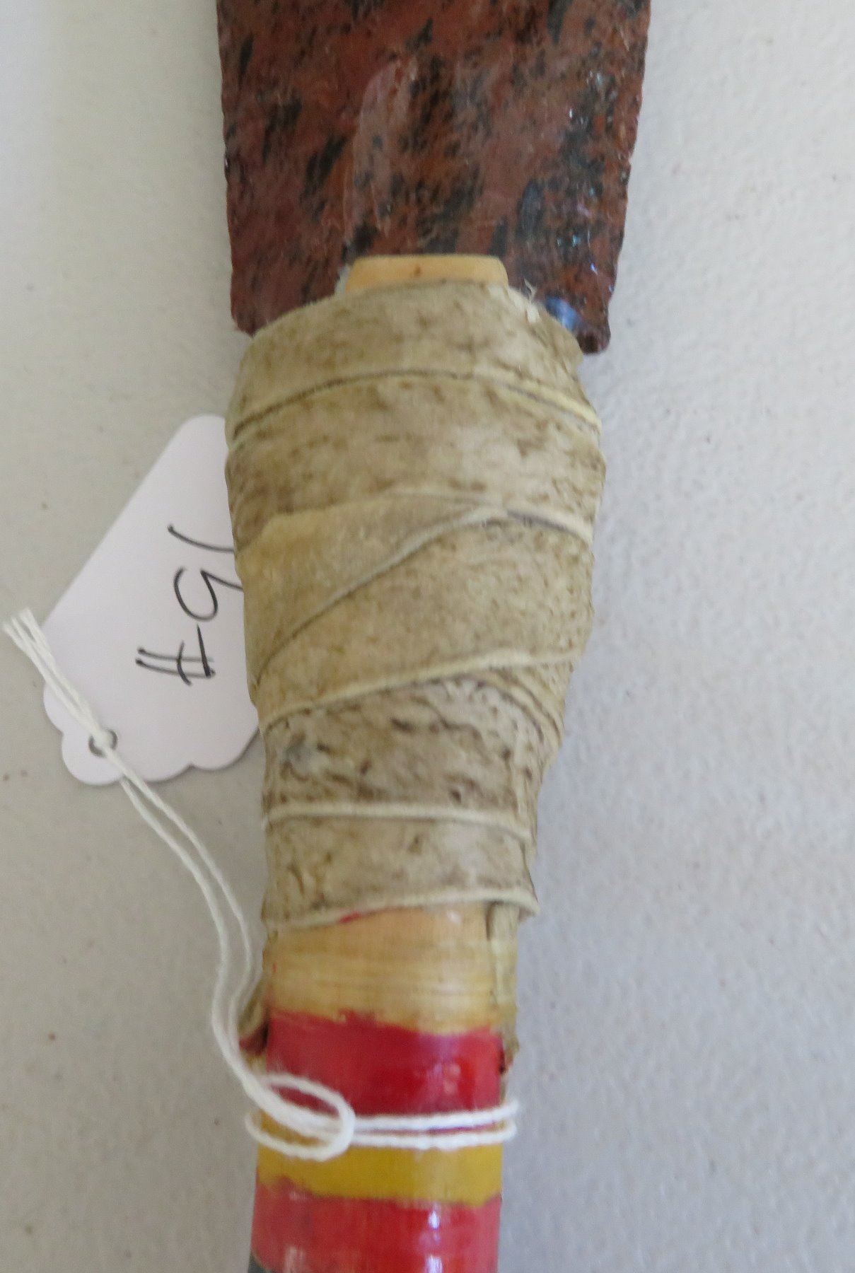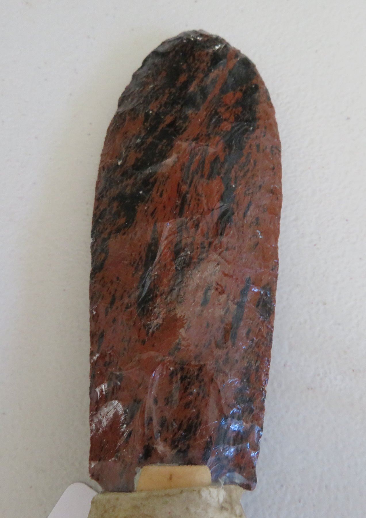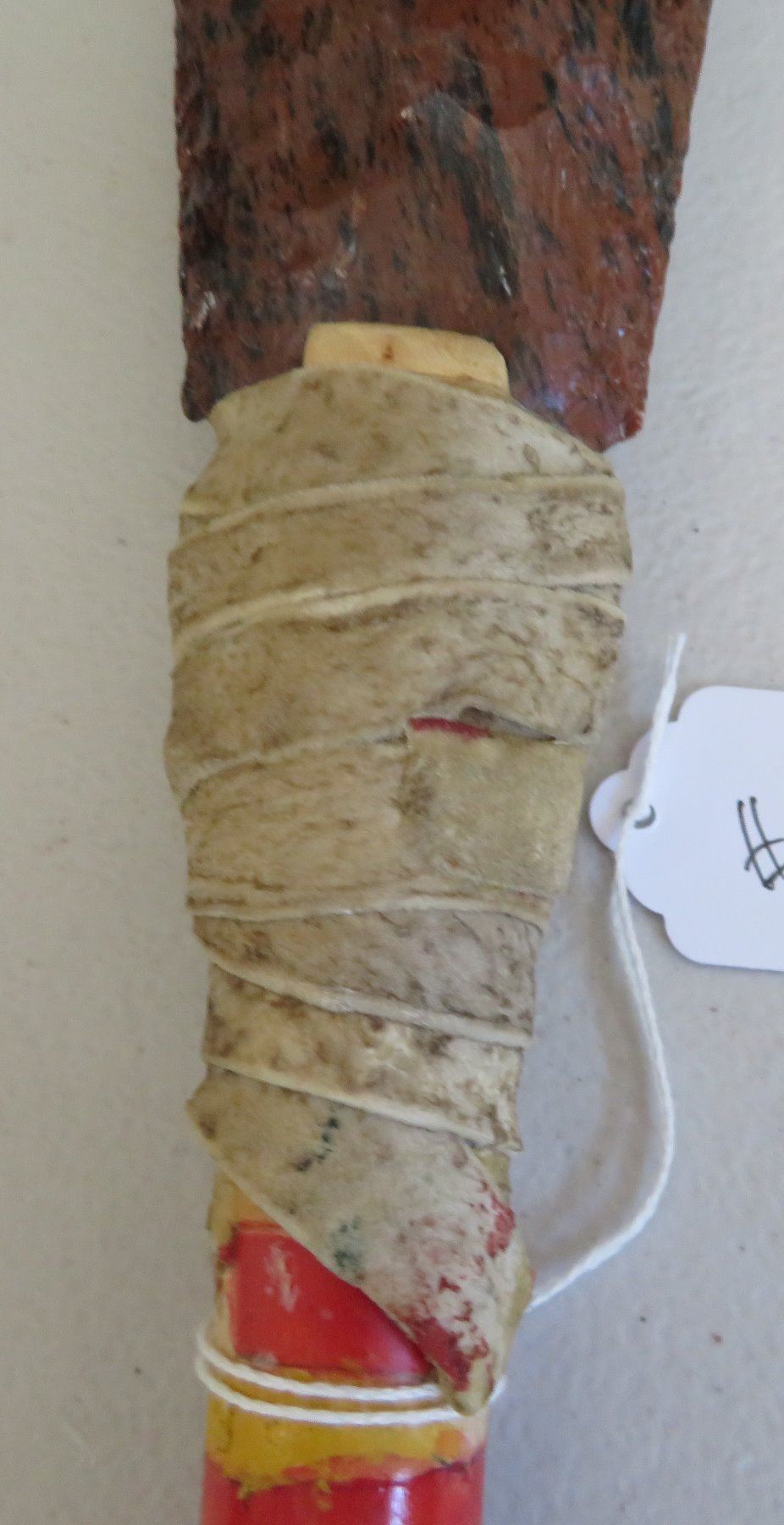 Hafted Hupa Obsidian Knife, c. 1900. Made of mahogany obsidian, leather and wool, the item measures overall 20" and the blade 7". Central California. Condition: Good, see images. Shipping: $34.50 w/insurance and signature, due to length.