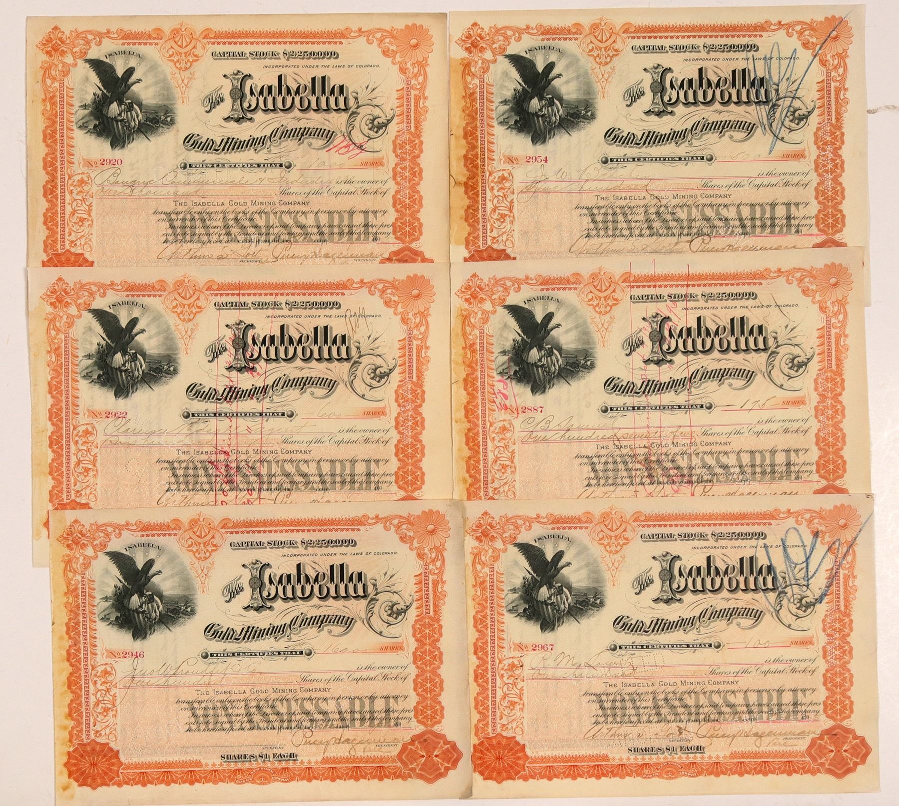 Lot of six. All 1895. All with Percy Hagerman signatures. Percy was the treasurer of the Pecos Valley & Northeastern Railway Company, president of the Mollie Gibson Consolidated Mining and Milling Company of Aspen, President of the Isabella, a charter member of the Colorado Springs Mining Stock Association, and a member of the Chamber of Commerce. He is the son of J. J. Hagerman, of Colorado Springs. Ken Prag Collection