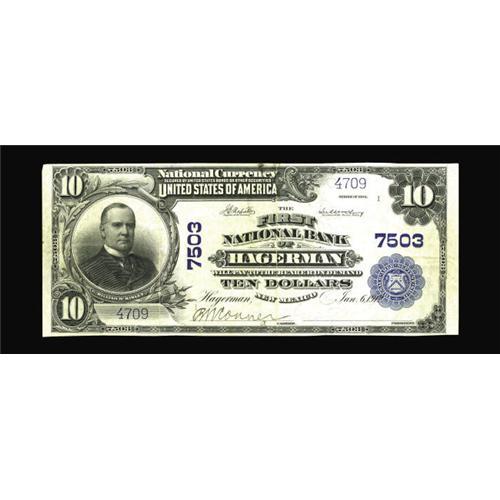 <B>Hagerman, NM</B></I> - $10 1902 Plain Back Fr. 628 <B>The First NB</B></I> Ch. # 7503<BR>This New Mexico rarity's pedigree can be traced back to the Burnworth collection sale in June of 1995, which is where our consignor obtained this high grade specimen. It is one of only six non-Territorial examples known from this tiny one bank community, and is just a touch nicer than the example from here that we sold for $9200 back in January of this year. <B>Very Fine-Extremely Fine.</B></I>