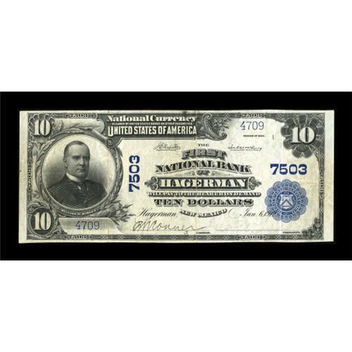 <B>Hagerman, NM</B></I> - $10 1902 Plain Back Fr. 628 <B>The Hagerman NB</B></I> Ch. # 7503<BR> This New Mexico rarity's pedigree can be traced back to the Burnworth Collection sale in June of 1995. It is one of only six non-Territorial examples known from this tiny one bank community, and is just a touch nicer than the example from here that we sold for $9200 back in January of 2006. <B>Very Fine-Extremely Fine.</B></I> <BR><BR><BR><b>Shipping:</b> Coins & Currency (<a target="_blank" href="http://www.heritageauctions.com/common/shipping.php">view shipping information</a>)