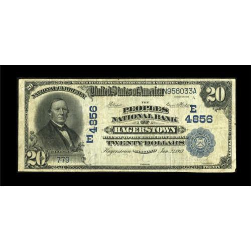 <B>Hagerstown, MD</B></I> - $20 1902 Date Back Fr. 647 <B>The Peoples NB</B></I> Ch. # (E)4856<BR> Broad margins and pleasing paper are noted on this $20 Date Back. A couple pinholes are noted for accuracy only. <B>Fine.</B></I><BR><I>From The Kansas City Collection.</B></I><BR><BR><b>Shipping:</b> Coins & Currency (<a target="_blank" href="http://www.heritageauctions.com/common/shipping.php">view shipping information</a>)