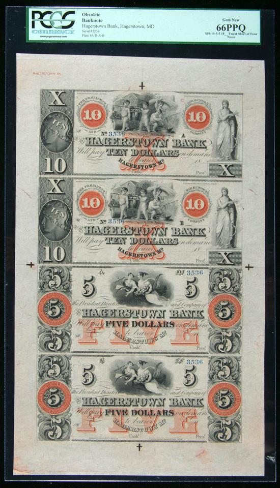 Hagerstown, MD. Hagerstown Bank. 18__ $10-10-5-5 Uncut Sheet of Remainders. PCGS Currency Gem New 66PPQ. A beautiful, nearly perfectly preserved uncut sheet of four remainders from this colorful 1850s issue. Printed by Danforth, Underwood & Co. of New York, these red and black notes are always popular with collectors--so much so that most remaining sheets have been cut to supply collectors with individual examples.