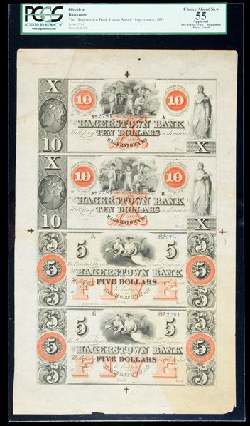 Hagerstown, MD - Hagerstown Bank Uncut Remainder Sheet of Four. $10-10-5-5. PCGS Choice About New 55 Apparent. An uncut remainder sheet of these popular red and black notes. Toning of the paper resulted in the Apparent grade.