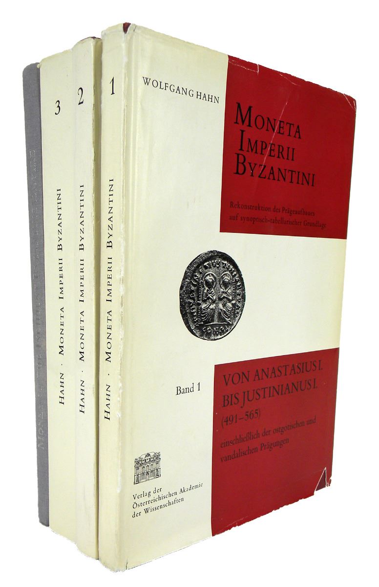 Hahn, Wolfgang. MONETA IMPERII BYZANTINI. Wien, 1973, 1975 and 1981. Three volumes. 4to, original matching red cloth, gilt; jackets. (4), 141, (1); 146; 315, (1) pages; 42 + 40 + 58 plates of coins; 13 + 13 + 16 folding tables. Jackets a bit worn; near fine. [with] Hahn, Wolfgang, and M.A. Metlich. MONEY OF THE INCIPIENT BYZANTINE EMPIRE (ANASTASIUS I-JUSTINIAN I, 491-565). Wien, 2000. 4to, original gray cloth lettered in silver. iv, 171, (1) pages; 35 plates of coins; folding synoptical charts. Fine. See catalogue for full description.