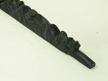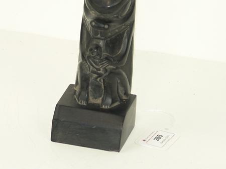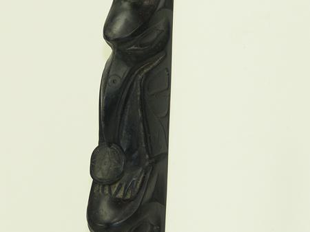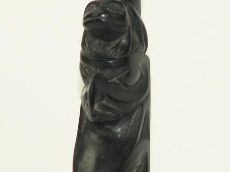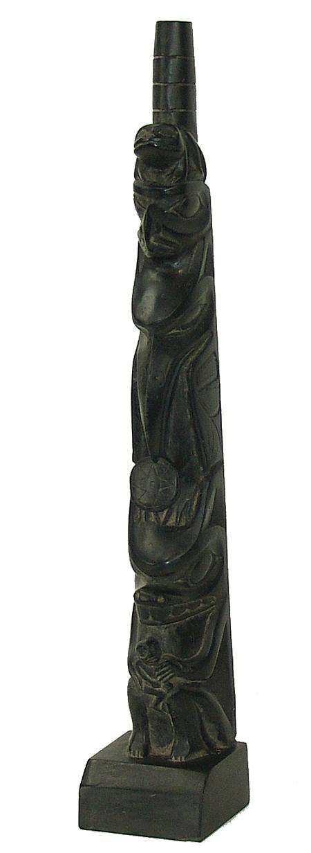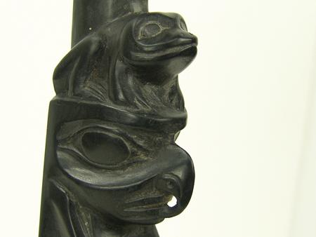 Circa Early/Mid 1900s, Traditional four figure pole with frog, eagle,  raven, and bear figures, the bear holding a small  human figure.  Very good condition, no flaws.  On  a base. 15" x 2-1/2"    From the Johnson Collection.