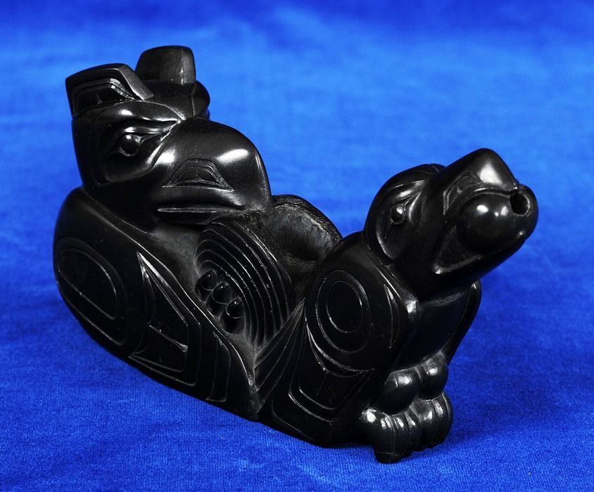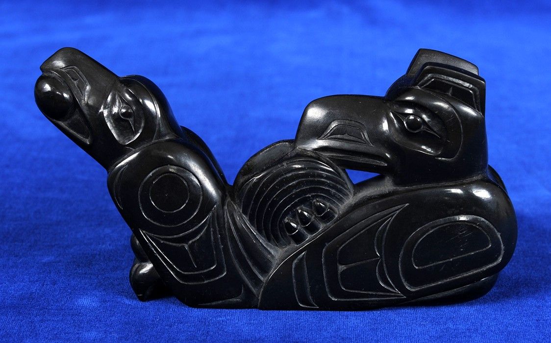 Haida Argillite Panel Pipe by Garnor Moody Depicts a Raven Holding a Clam Shell (Pipe Bowl) and a Raven with the Moon in His Beak (Stem). 6" L. 3" H. Fine Condition