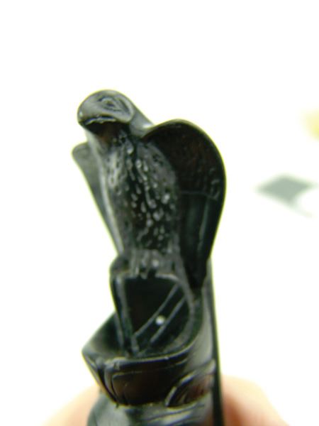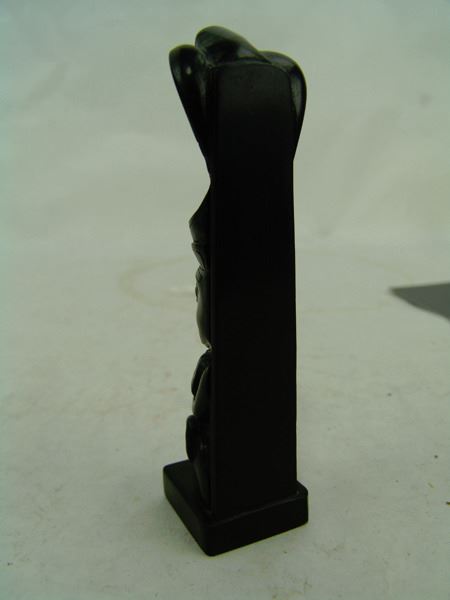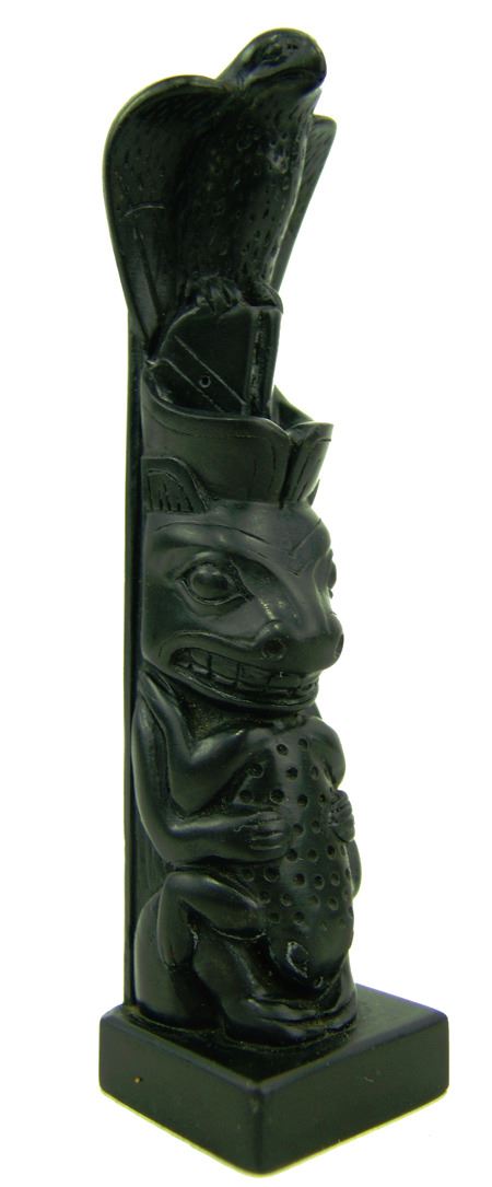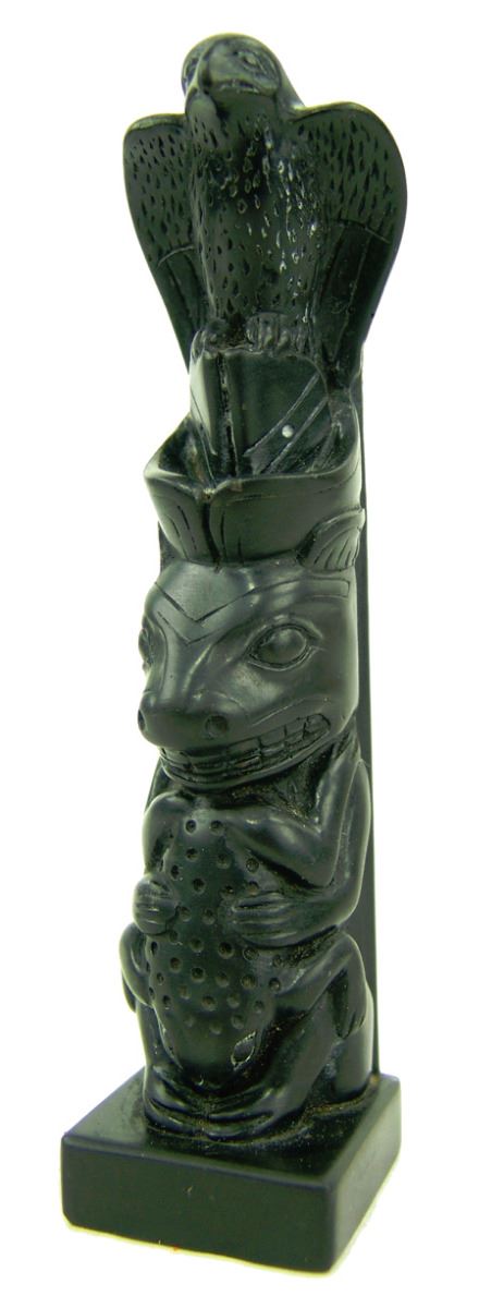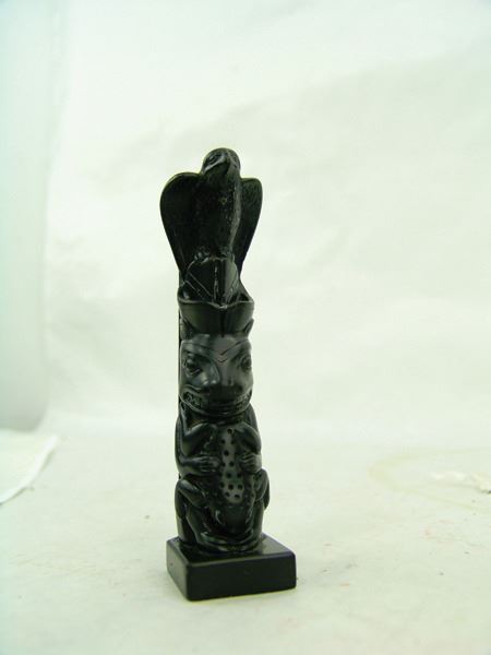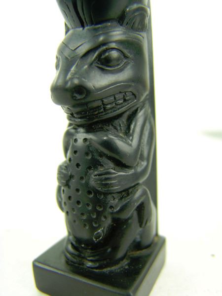 Mid 1900s, Very fine hand carved three-figure (eagle/frog/bear) black argillite totem carving on base. Very good condition. 5"