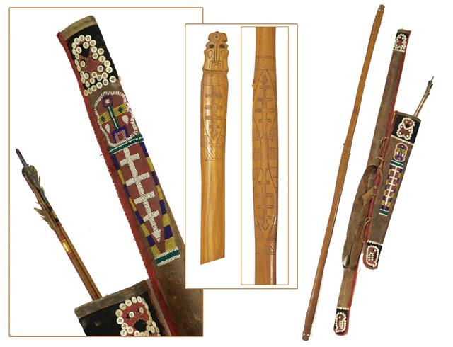 Early/Mid 1900s, Pair of rare decorated containers with accents in the style of a button blanket with beaded symbols. Bow case 65" x 3-1/2", quiver 32" x 6-1/2"