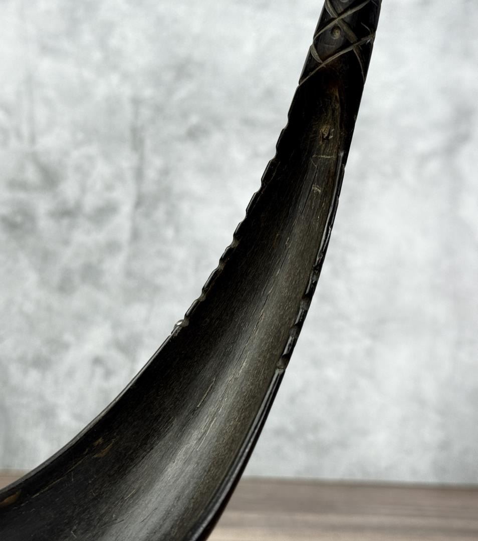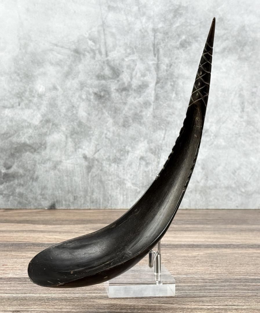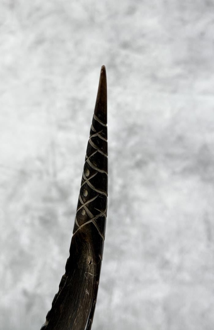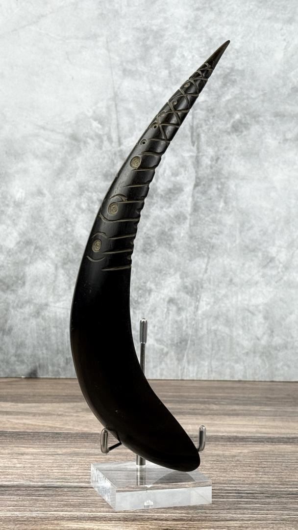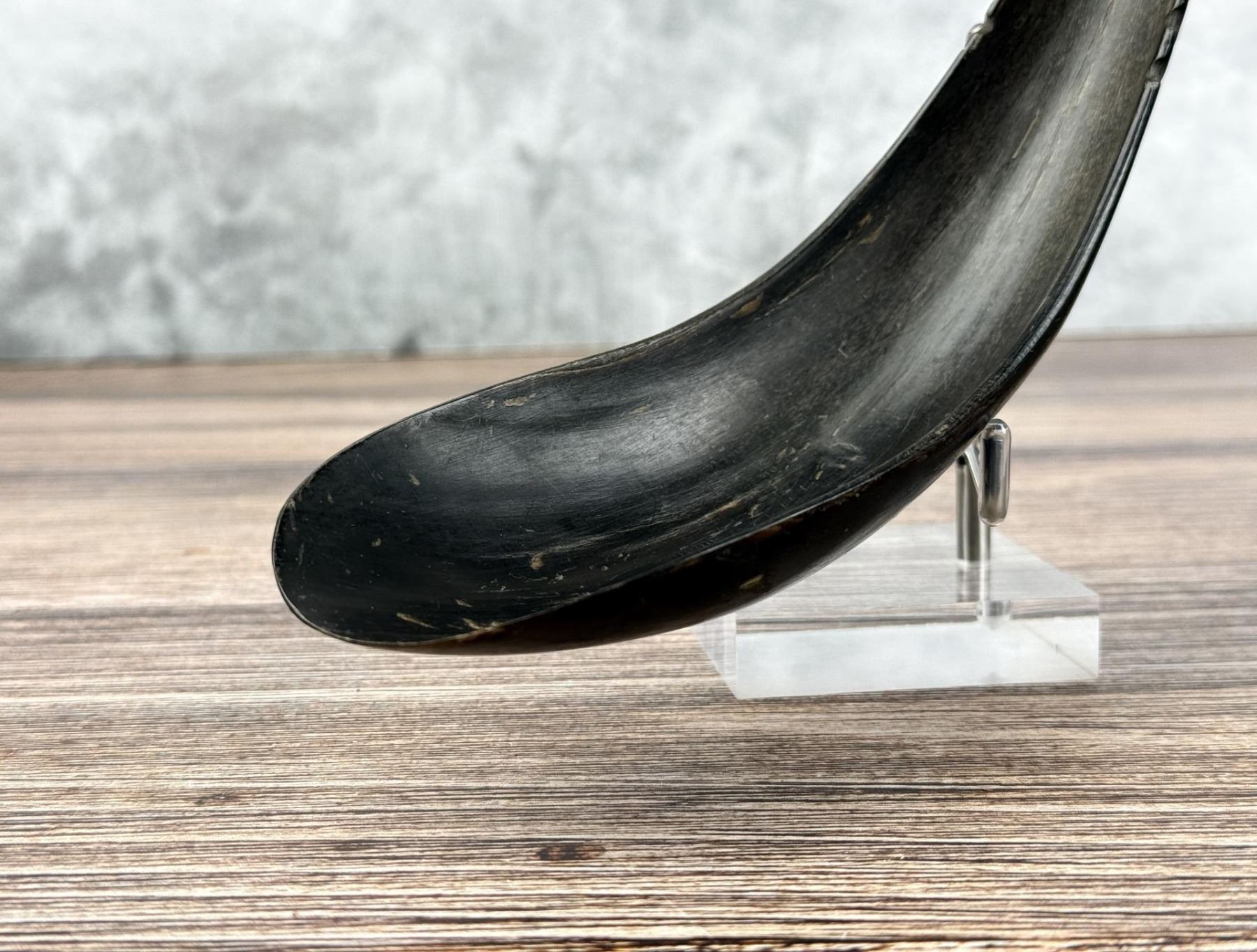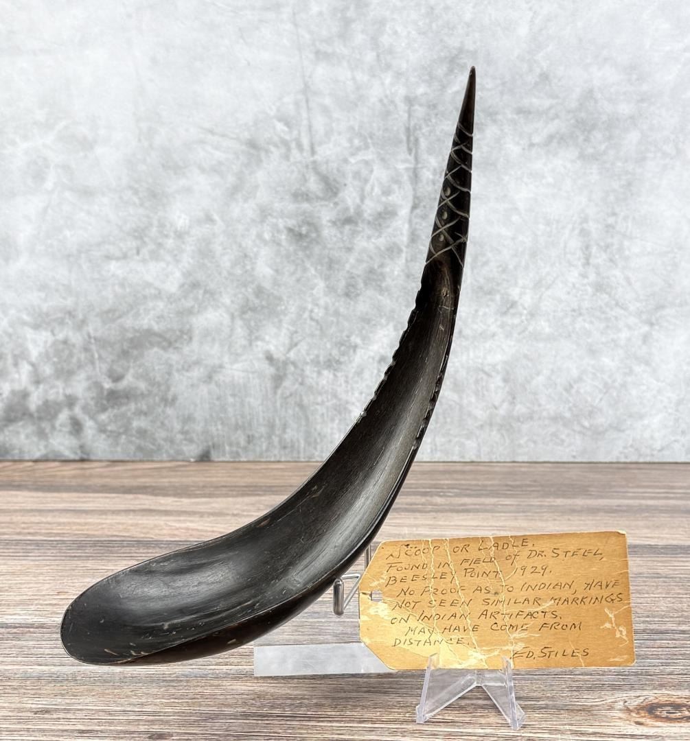 10 1/8" long. Made from Mountain Goat Horn. Recovered from a field in Beesley Point New Jersey in 1929, was more than likely lost during a Indian delegation meeting on the east coast. Mid 19th Century.