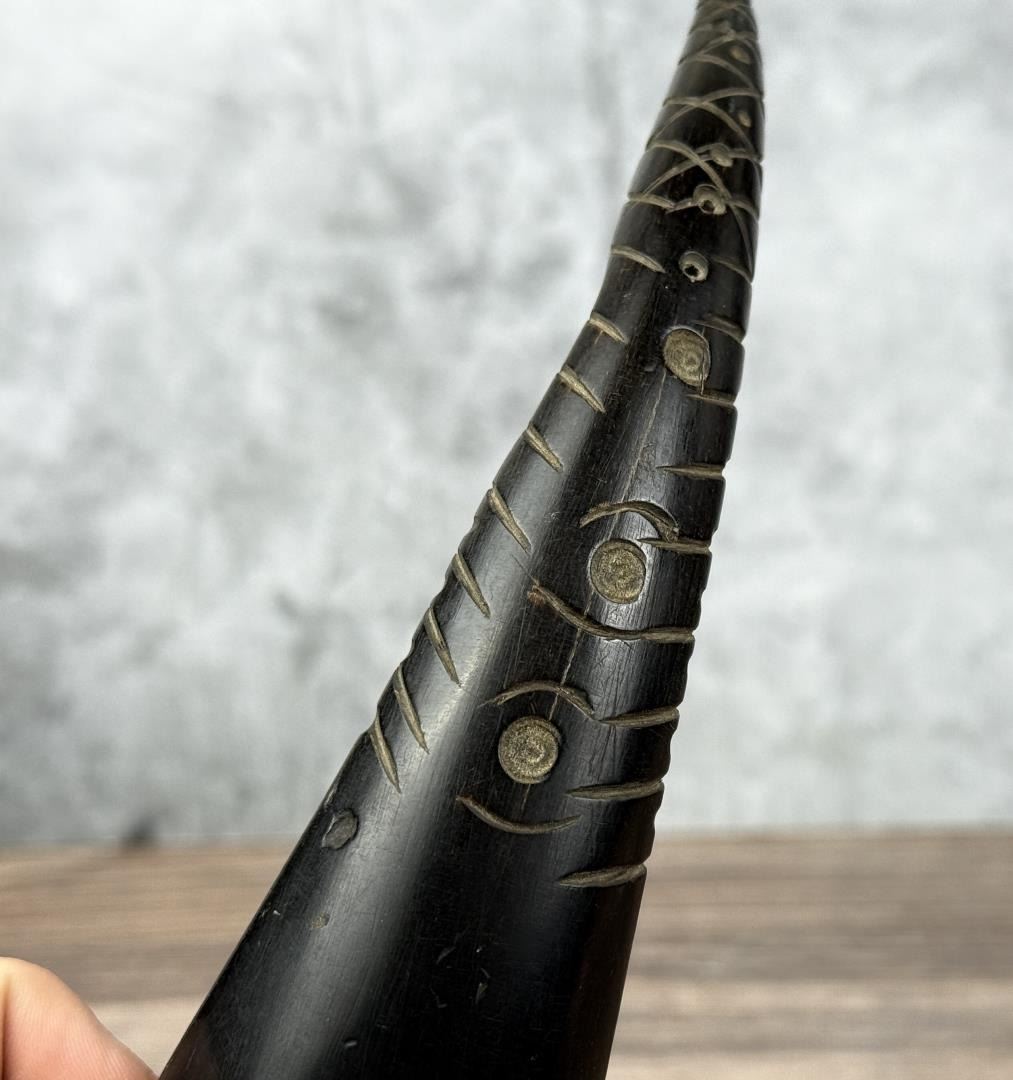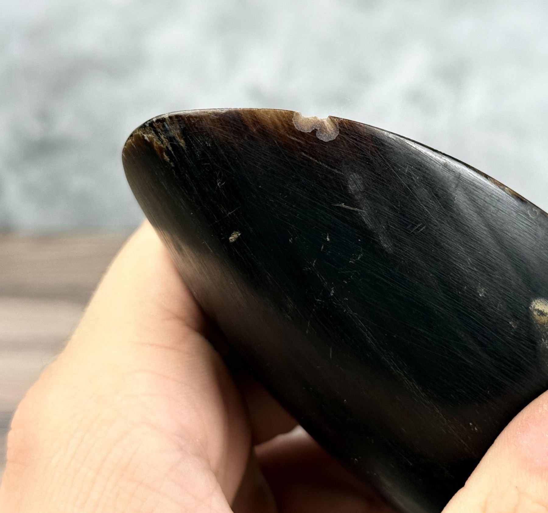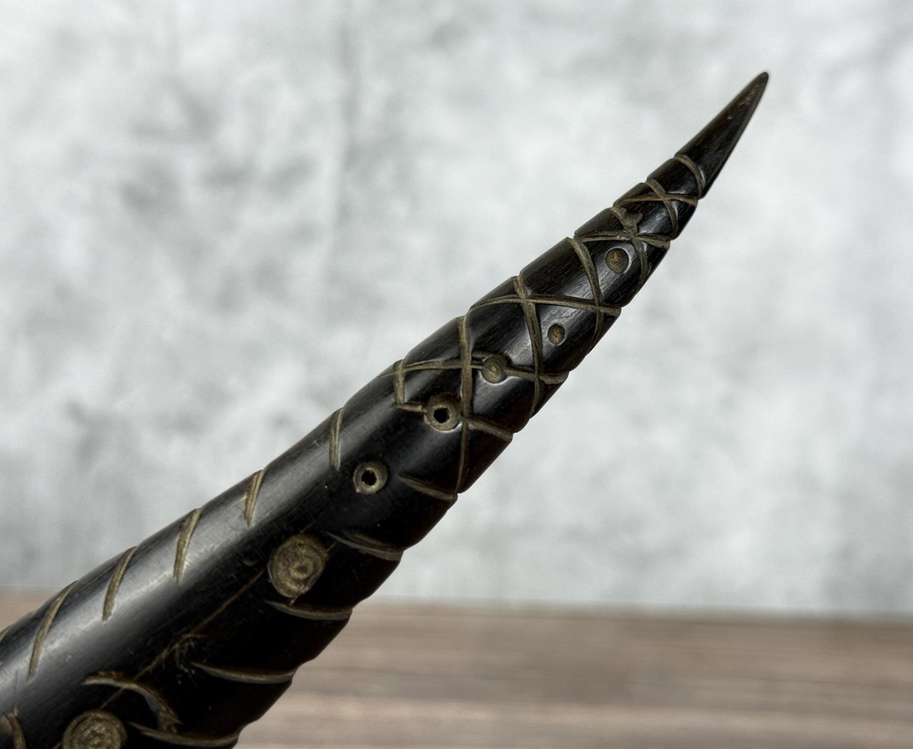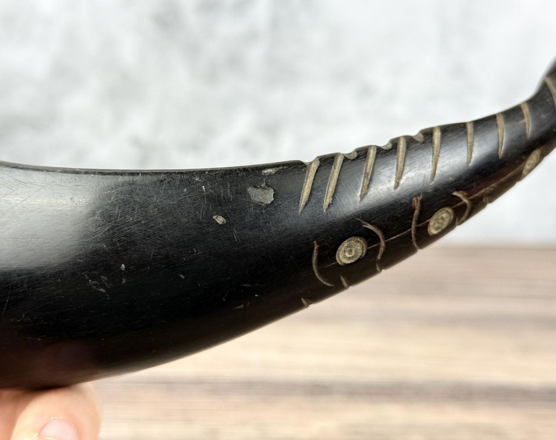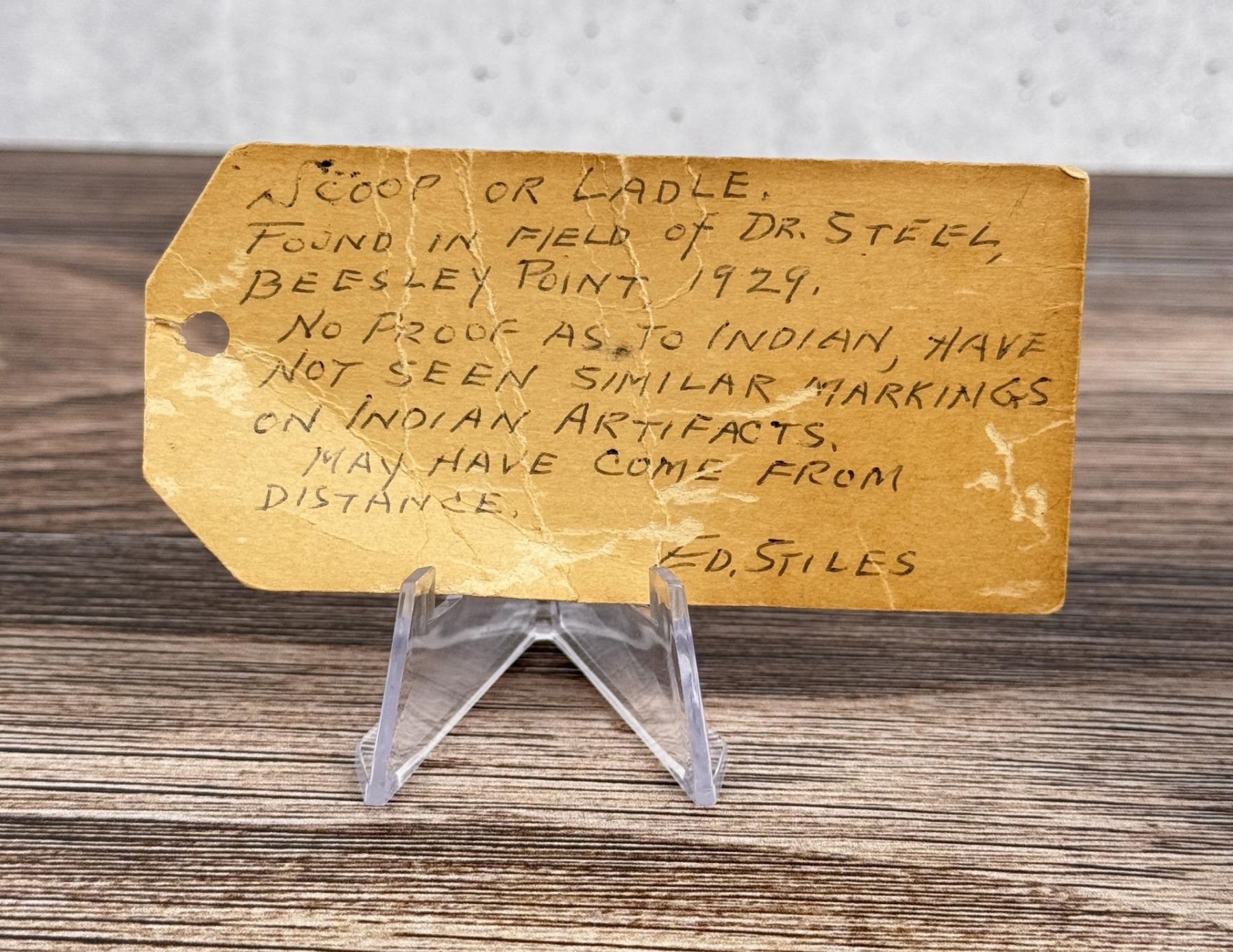 10 1/8" long. Made from Mountain Goat Horn. Recovered from a field in Beesley Point New Jersey in 1929, was more than likely lost during a Indian delegation meeting on the east coast. Mid 19th Century.
