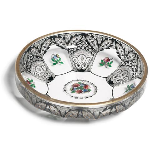 Haida bowl, attribution, faceted form in clear glass with colorful enameled designs, unmarked,6in.w