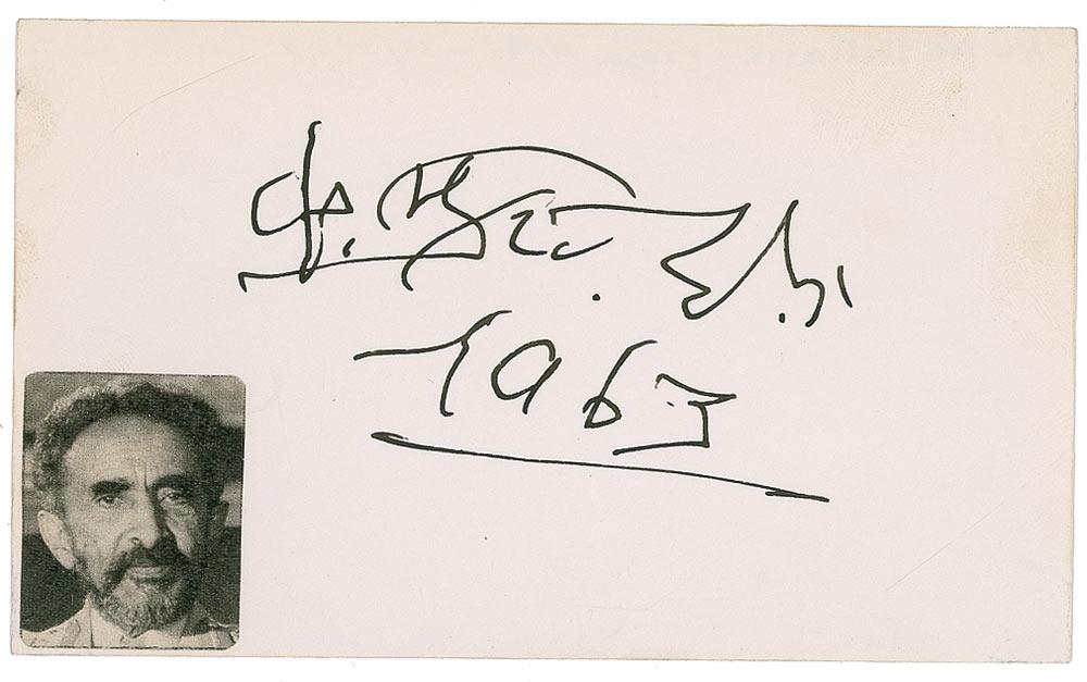 Longtime Emperor of Ethiopia (1892–1975) who reigned from 1930 to 1974. Selassie was one of the most revered figures among followers of the Rastafari movement, whose members viewed him as a symbol of God incarnate. Black ink signature and date, “Haile Selassie 1963,” on an off-white 5 x 3 card. A small image of Selassie is affixed at the bottom left corner. In fine condition, with light toning.