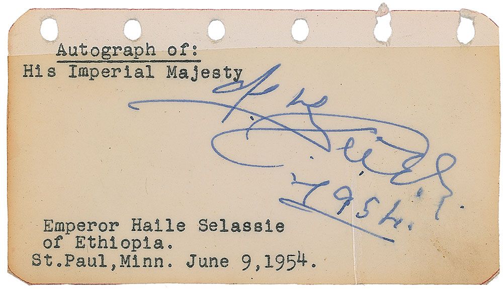 Longtime Emperor of Ethiopia (1892–1975) who reigned from 1930 to 1974. Selassie was one of the most revered figures among followers of the Rastafari movement, whose members viewed him as a symbol of God incarnate. Uncommon vintage ink signature on an off-white 4.5 x 2.5 page, dated 1954. In very good condition, with toning and soiling to borders and a clear piece of tape affixed over the entire page.