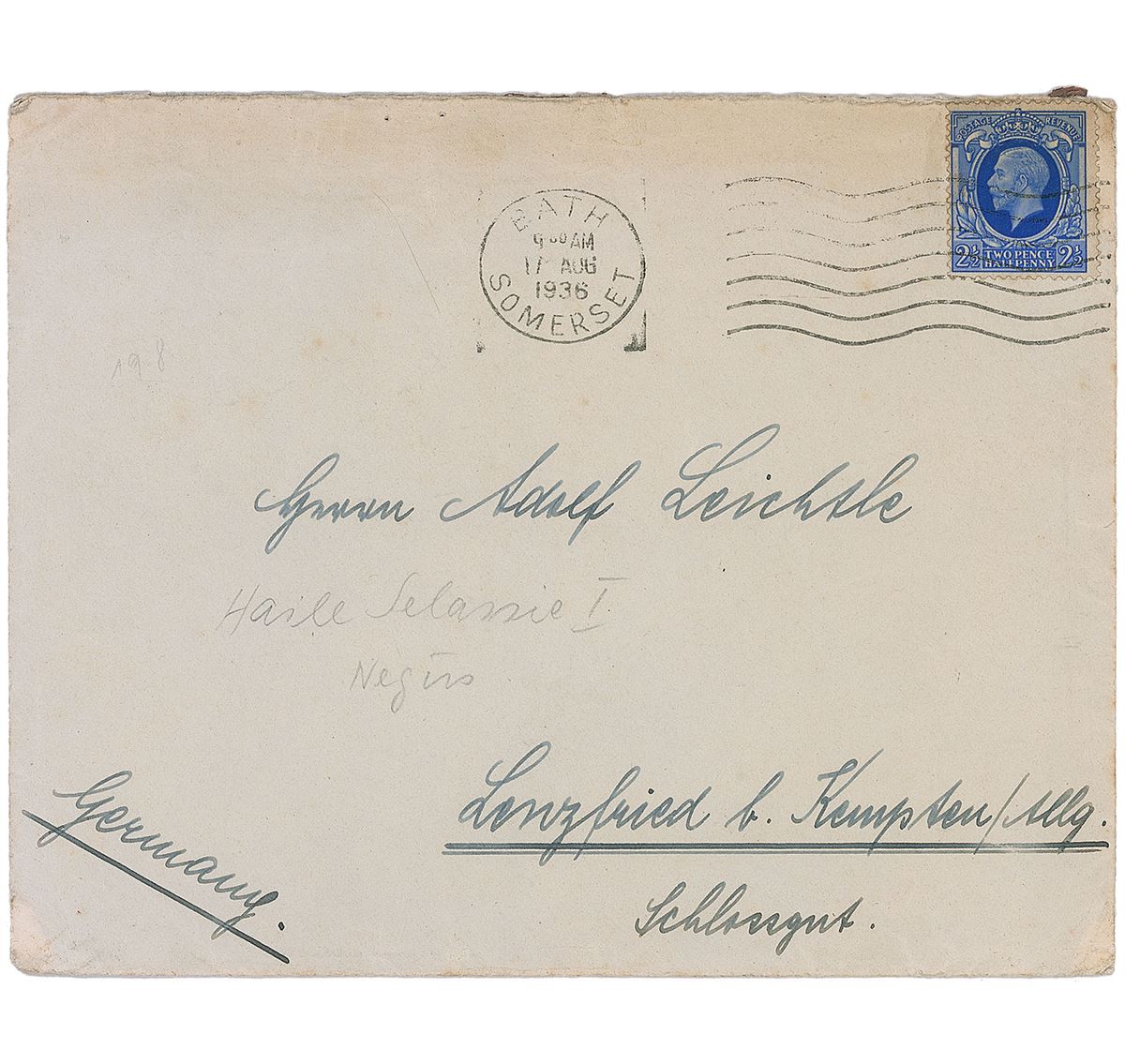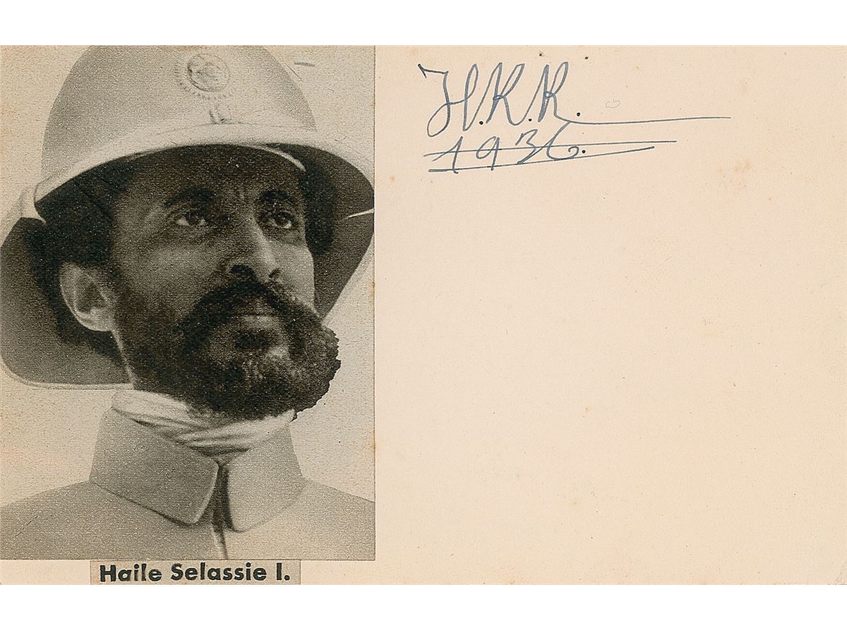 Fountain pen signature, “H. R. R., 1936,” on an off-white 5.5 x 3.5 card with an affixed magazine photo. Accompanied by a transmittal envelope and catalogue card from an early collector. In fine condition, with staple holes and trivial foxing.