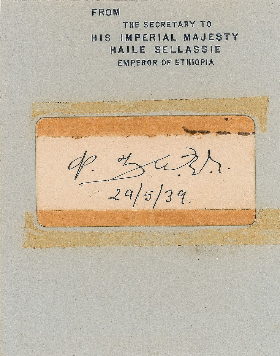 Longtime Emperor of Ethiopia (1892–1975) who reigned from 1930 to 1974; Selassie is one of the most revered figures among followers of the Rastafari movement, whose members view him as a symbol of God incarnate. Fountain pen signature of Haile Selassie on an off-white 3 x 1.5 card. In fine condition, with adhesive stains along edges that could easily be matted out. Accompanied by a transmittal slip to which it was once affixed.