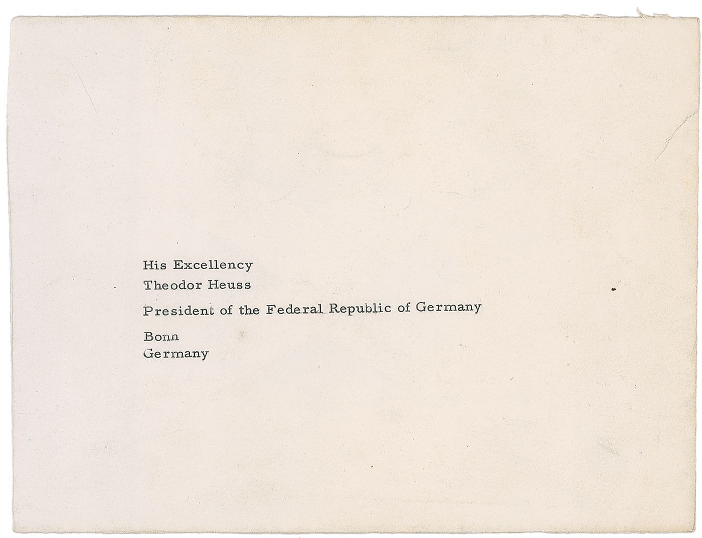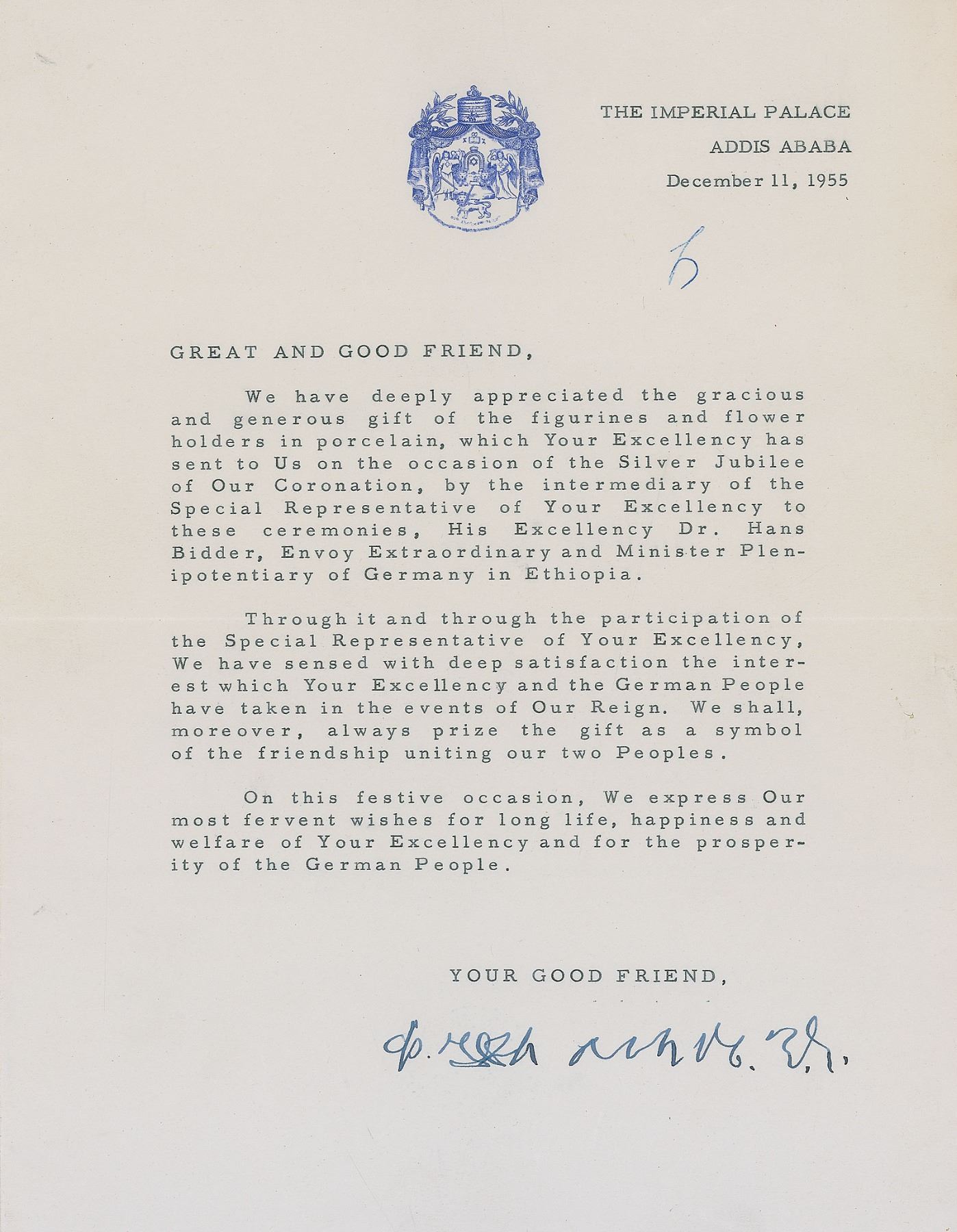 Longtime Emperor of Ethiopia (1892–1975) who reigned from 1930 to 1974. Selassie is one of the most revered figures among followers of the Rastafari movement, whose members view him as a symbol of God incarnate. TLS, one page, 8.25 x 10.75, official Imperial Palace letterhead, December 11, 1955. Letter to Theodor Heuss, the first President of the Federal Republic of Germany. In part: "We have deeply appreciated the gracious and generous gift of the figurines and flower holders in porcelain, which Your Excellency has sent to Us on the occasion of the Silver Jubilee of Our Coronation, by the intermediary of the Special Representative Of Your Excellency to these ceremonies, His Excellency Dr. Hans Bidder, Envoy Extraordinary Minister Plentipotentiary of Germany in Ethiopia." In fine condition. Accompanied by the original transmittal envelope. The year before, Emperor Haile Selassie became the first foreign head of state to visit the Federal Republic of Germany, then generally referred to as West Germany. Selassie was interested in learning how the technical achievements of the west could be imported to his empire on the Horn of Africa, visiting steelworks and hospitals throughout Germany. The diplomatic bonds forged between the nations during this trip laid the foundation for strong ties today, and Germany remains one of the largest export markets for Ethiopian goods.