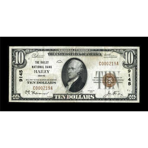 <B>Hailey, ID</B></I> - $10 1929 Ty. 1 <B>The Hailey NB</B></I> Ch. # 9145<BR> A very scarce bank which is just as difficult to obtain in small size as large. Sharp <B>Very Fine.</B></I><BR><BR><b>Shipping:</b> Coins & Currency (<a target="_blank" href="http://www.heritageauctions.com/common/shipping.php">view shipping information</a>)
